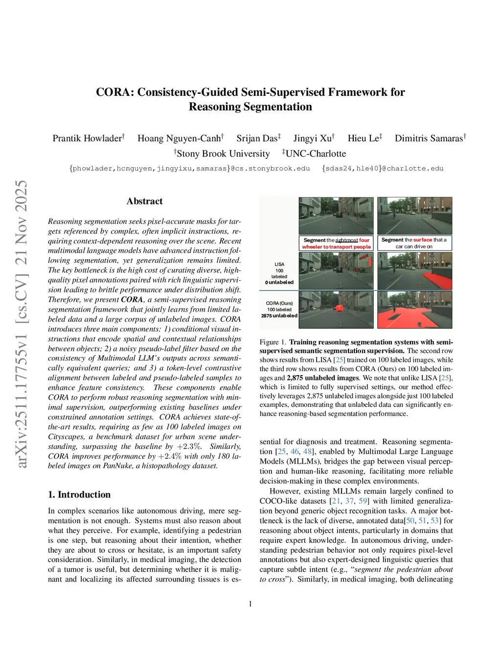 Reasoning segmentation seeks pixel-accurate masks for targets referenced by complex, often implicit instructions, requiring context-dependent reasoning over the scene. Recent multimodal language models have advanced instruction following segmentation, yet generalization remains limited. The key bottleneck is the high cost of curating diverse, high-quality pixel annotations paired with rich linguistic supervision leading to brittle performance under distribution shift. Therefore, we present CORA, a semi-supervised reasoning segmentation framework that jointly learns from limited labeled data and a large corpus of unlabeled images. CORA introduces three main components: 1) conditional visual instructions that encode spatial and contextual relationships between objects; 2) a noisy pseudo-label filter based on the consistency of Multimodal LLM's outputs across semantically equivalent queries; and 3) a token-level contrastive alignment between labeled and pseudo-labeled samples to enhance feature consistency. These components enable CORA to perform robust reasoning segmentation with minimal supervision, outperforming existing baselines under constrained annotation settings. CORA achieves state-of-the-art results, requiring as few as 100 labeled images on Cityscapes, a benchmark dataset for urban scene understanding, surpassing the baseline by . Similarly, CORA improves performance by with only 180 labeled images on PanNuke, a histopathology dataset.