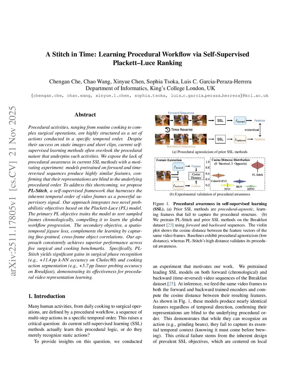 Procedural activities, ranging from routine cooking to complex surgical operations, are highly structured as a set of actions conducted in a specific temporal order. Despite their success on static images and short clips, current self-supervised learning methods often overlook the procedural nature that underpins such activities. We expose the lack of procedural awareness in current SSL methods with a motivating experiment: models pretrained on forward and time-reversed sequences produce highly similar features, confirming that their representations are blind to the underlying procedural order. To address this shortcoming, we propose PL-Stitch, a self-supervised framework that harnesses the inherent temporal order of video frames as a powerful supervisory signal. Our approach integrates two novel probabilistic objectives based on the Plackett-Luce (PL) model. The primary PL objective trains the model to sort sampled frames chronologically, compelling it to learn the global workflow progression. The secondary objective, a spatio-temporal jigsaw loss, complements the learning by capturing fine-grained, cross-frame object correlations. Our approach consistently achieves superior performance across five surgical and cooking benchmarks. Specifically, PL-Stitch yields significant gains in surgical phase recognition (e.g., +11.4 pp k-NN accuracy on Cholec80) and cooking action segmentation (e.g., +5.7 pp linear probing accuracy on Breakfast), demonstrating its effectiveness for procedural video representation learning.