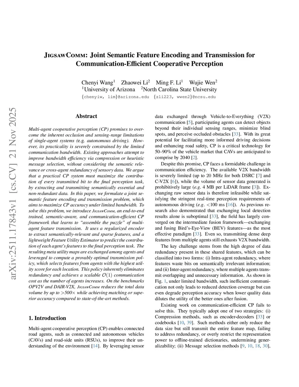 Multi-agent cooperative perception (CP) promises to overcome the inherent occlusion and range limitations of single-agent systems in autonomous driving, yet its practicality is severely constrained by limited Vehicle-to-Everything (V2X) communication bandwidth. Existing approaches attempt to improve bandwidth efficiency via compression or heuristic message selection, but neglect the semantic relevance and cross-agent redundancy of the transmitted data. In this paper, we formulate a joint semantic feature encoding and transmission problem that maximizes CP accuracy under a communication budget, and introduce JigsawComm, an end-to-end semantic-aware framework that learns to ``assemble the puzzle'' of multi-agent feature transmission. JigsawComm uses a regularized encoder to extract \emph{sparse, semantically relevant features}, and a lightweight Feature Utility Estimator (FUE) to predict each agent's per-cell contribution to the downstream perception task. The FUE-generated compact meta utility maps are exchanged among agents and used to compute an optimal transmission policy under the learned utility proxy. This policy inherently \emph{eliminates cross-agent redundancy}, bounding the feature transmission payload to as the number of agents grows, while the meta information overhead remains negligible. The whole pipeline is trained end-to-end through a differentiable scheduling module, informing the FUE to be aligned with the task objective. On the OPV2V and DAIR-V2X benchmarks, JigsawComm reduces total data volume by over 20--500 while matching or exceeding the accuracy of state-of-the-art methods.