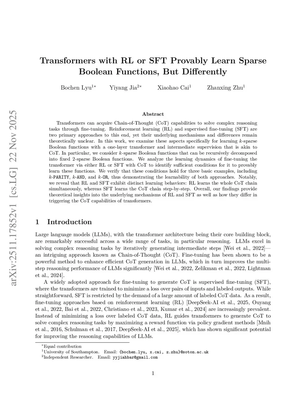 Transformers with RL or SFT Provably Learn Sparse Boolean Functions, But Differently