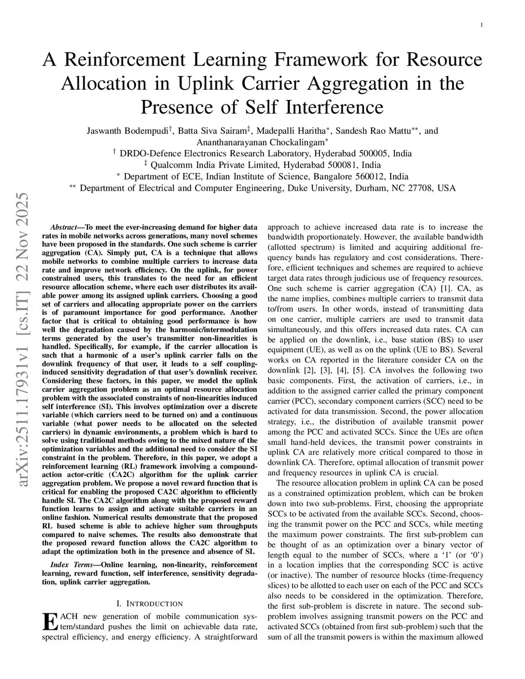 A Reinforcement Learning Framework for Resource Allocation in Uplink Carrier Aggregation in the Presence of Self Interference
