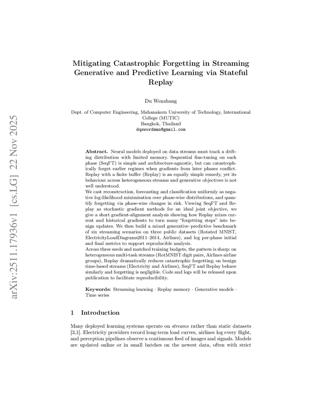 Many deployed learning systems must update models on streaming data under memory constraints. The default strategy, sequential fine-tuning on each new phase, is architecture-agnostic but often suffers catastrophic forgetting when later phases correspond to different sub-populations or tasks. Replay with a finite buffer is a simple alternative, yet its behaviour across generative and predictive objectives is not well understood. We present a unified study of stateful replay for streaming autoencoding, time series forecasting, and classification. We view both sequential fine-tuning and replay as stochastic gradient methods for an ideal joint objective, and use a gradient alignment analysis to show when mixing current and historical samples should reduce forgetting. We then evaluate a single replay mechanism on six streaming scenarios built from Rotated MNIST, ElectricityLoadDiagrams 2011-2014, and Airlines delay data, using matched training budgets and three seeds. On heterogeneous multi task streams, replay reduces average forgetting by a factor of two to three, while on benign time based streams both methods perform similarly. These results position stateful replay as a strong and simple baseline for continual learning in streaming environments.
