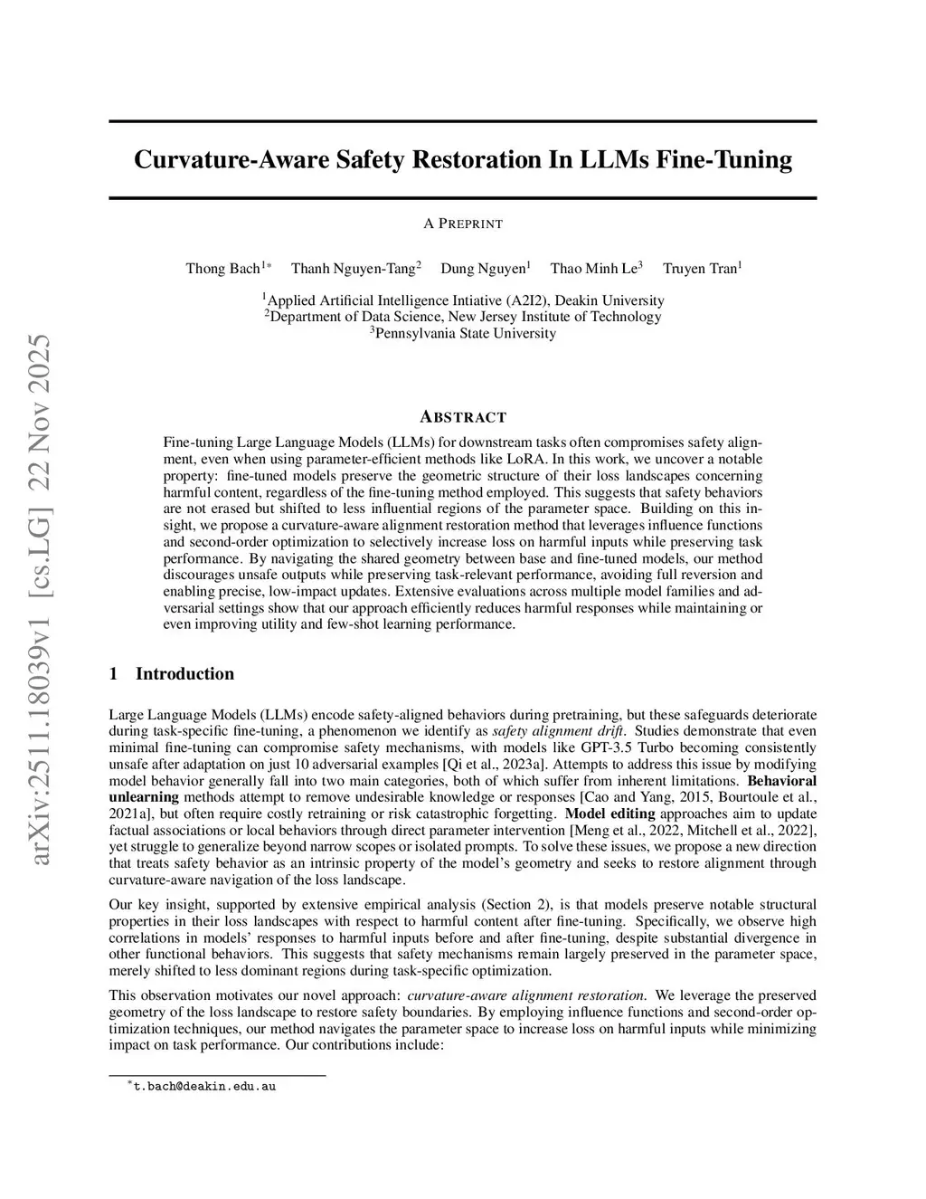 Fine-tuning Large Language Models (LLMs) for downstream tasks often compromises safety alignment, even when using parameter-efficient methods like LoRA. In this work, we uncover a notable property: fine-tuned models preserve the geometric structure of their loss landscapes concerning harmful content, regardless of the fine-tuning method employed. This suggests that safety behaviors are not erased but shifted to less influential regions of the parameter space. Building on this insight, we propose a curvature-aware alignment restoration method that leverages influence functions and second-order optimization to selectively increase loss on harmful inputs while preserving task performance. By navigating the shared geometry between base and fine-tuned models, our method discourages unsafe outputs while preserving task-relevant performance, avoiding full reversion and enabling precise, low-impact updates. Extensive evaluations across multiple model families and adversarial settings show that our approach efficiently reduces harmful responses while maintaining or even improving utility and few-shot learning performance.