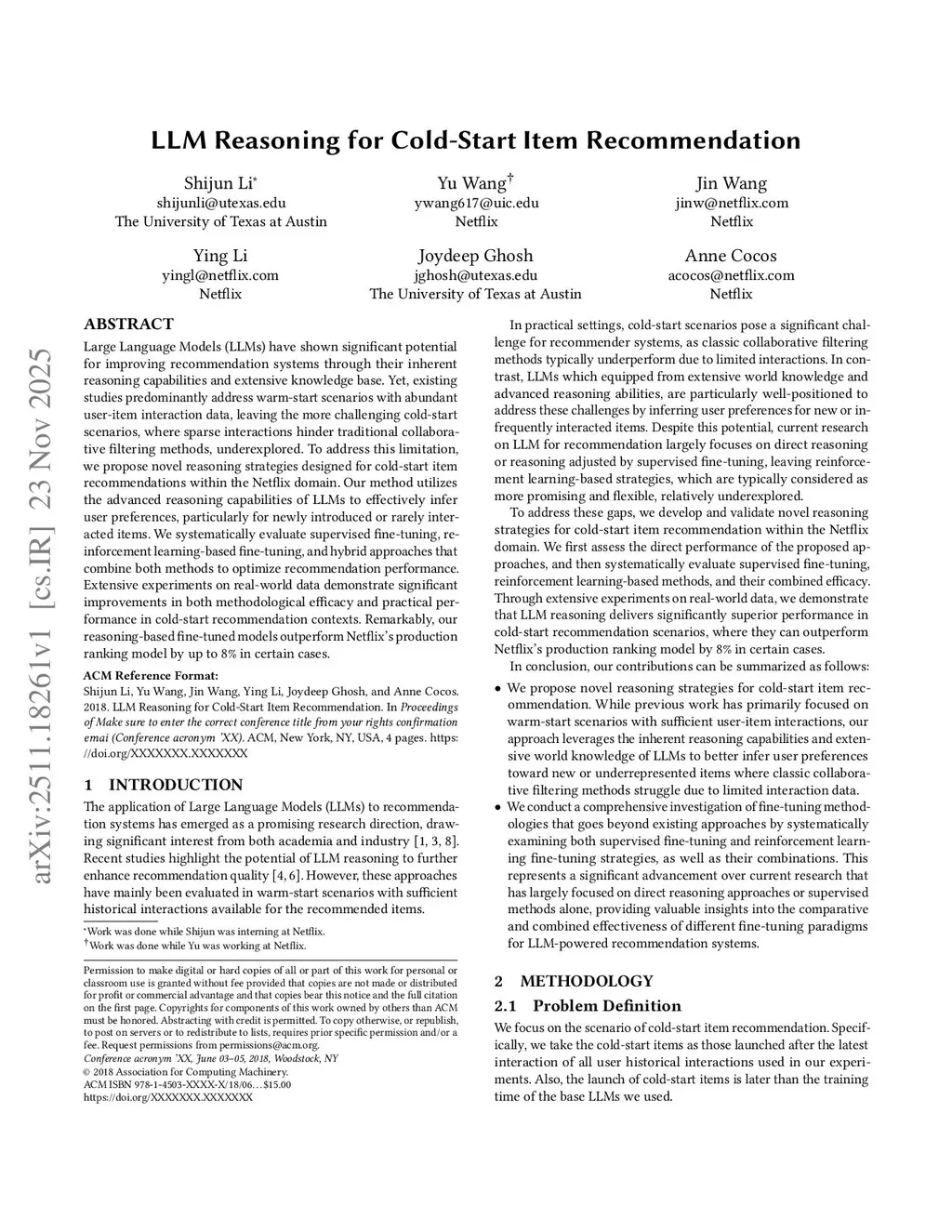 Large Language Models (LLMs) have shown significant potential for improving recommendation systems through their inherent reasoning capabilities and extensive knowledge base. Yet, existing studies predominantly address warm-start scenarios with abundant user-item interaction data, leaving the more challenging cold-start scenarios, where sparse interactions hinder traditional collaborative filtering methods, underexplored. To address this limitation, we propose novel reasoning strategies designed for cold-start item recommendations within the Netflix domain. Our method utilizes the advanced reasoning capabilities of LLMs to effectively infer user preferences, particularly for newly introduced or rarely interacted items. We systematically evaluate supervised fine-tuning, reinforcement learning-based fine-tuning, and hybrid approaches that combine both methods to optimize recommendation performance. Extensive experiments on real-world data demonstrate significant improvements in both methodological efficacy and practical performance in cold-start recommendation contexts. Remarkably, our reasoning-based fine-tuned models outperform Netflix's production ranking model by up to 8% in certain cases.