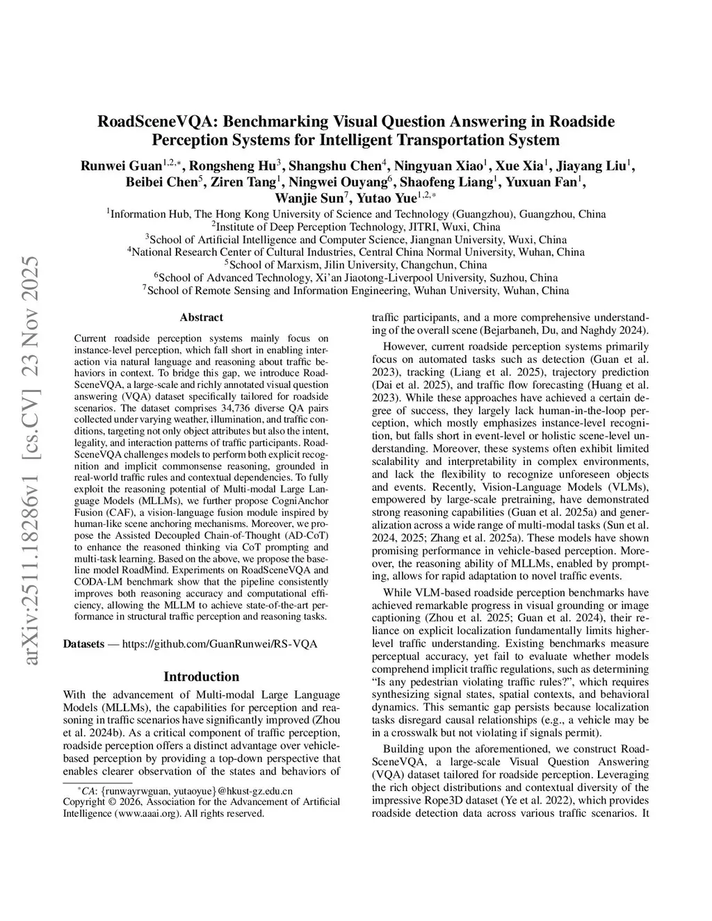 Current roadside perception systems mainly focus on instance-level perception, which fall short in enabling interaction via natural language and reasoning about traffic behaviors in context. To bridge this gap, we introduce RoadSceneVQA, a large-scale and richly annotated visual question answering (VQA) dataset specifically tailored for roadside scenarios. The dataset comprises 34,736 diverse QA pairs collected under varying weather, illumination, and traffic conditions, targeting not only object attributes but also the intent, legality, and interaction patterns of traffic participants. RoadSceneVQA challenges models to perform both explicit recognition and implicit commonsense reasoning, grounded in real-world traffic rules and contextual dependencies. To fully exploit the reasoning potential of Multi-modal Large Language Models (MLLMs), we further propose CogniAnchor Fusion (CAF), a vision-language fusion module inspired by human-like scene anchoring mechanisms. Moreover, we propose the Assisted Decoupled Chain-of-Thought (AD-CoT) to enhance the reasoned thinking via CoT prompting and multi-task learning. Based on the above, we propose the baseline model RoadMind. Experiments on RoadSceneVQA and CODA-LM benchmark show that the pipeline consistently improves both reasoning accuracy and computational efficiency, allowing the MLLM to achieve state-of-the-art performance in structural traffic perception and reasoning tasks.