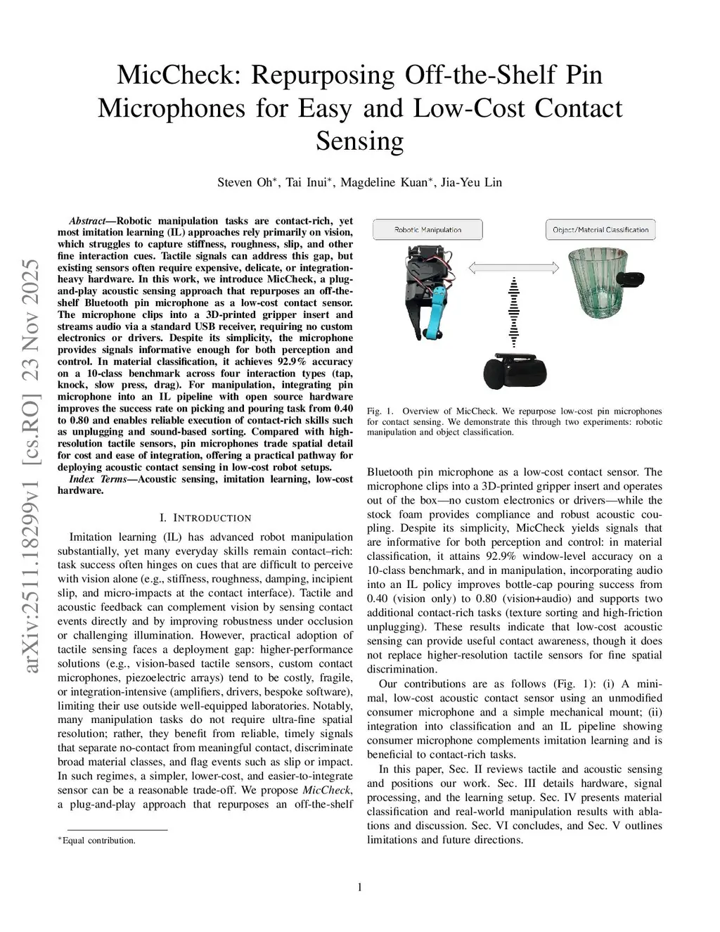 Robotic manipulation tasks are contact-rich, yet most imitation learning (IL) approaches rely primarily on vision, which struggles to capture stiffness, roughness, slip, and other fine interaction cues. Tactile signals can address this gap, but existing sensors often require expensive, delicate, or integration-heavy hardware. In this work, we introduce MicCheck, a plug-and-play acoustic sensing approach that repurposes an off-the-shelf Bluetooth pin microphone as a low-cost contact sensor. The microphone clips into a 3D-printed gripper insert and streams audio via a standard USB receiver, requiring no custom electronics or drivers. Despite its simplicity, the microphone provides signals informative enough for both perception and control. In material classification, it achieves 92.9% accuracy on a 10-class benchmark across four interaction types (tap, knock, slow press, drag). For manipulation, integrating pin microphone into an IL pipeline with open source hardware improves the success rate on picking and pouring task from 0.40 to 0.80 and enables reliable execution of contact-rich skills such as unplugging and sound-based sorting. Compared with high-resolution tactile sensors, pin microphones trade spatial detail for cost and ease of integration, offering a practical pathway for deploying acoustic contact sensing in low-cost robot setups.