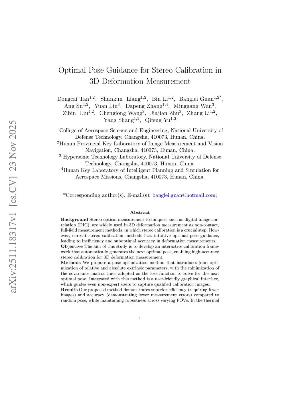 Stereo optical measurement techniques, such as digital image correlation (DIC), are widely used in 3D deformation measurement as non-contact, full-field measurement methods, in which stereo calibration is a crucial step. However, current stereo calibration methods lack intuitive optimal pose guidance, leading to inefficiency and suboptimal accuracy in deformation measurements. The aim of this study is to develop an interactive calibration framework that automatically generates the next optimal pose, enabling high-accuracy stereo calibration for 3D deformation measurement. We propose a pose optimization method that introduces joint optimization of relative and absolute extrinsic parameters, with the minimization of the covariance matrix trace adopted as the loss function to solve for the next optimal pose. Integrated with this method is a user-friendly graphical interface, which guides even non-expert users to capture qualified calibration images. Our proposed method demonstrates superior efficiency (requiring fewer images) and accuracy (demonstrating lower measurement errors) compared to random pose, while maintaining robustness across varying FOVs. In the thermal deformation measurement tests on an S-shaped specimen, the results exhibit high agreement with finite element analysis (FEA) simulations in both deformation magnitude and evolutionary trends. We present a pose guidance method for high-precision stereo calibration in 3D deformation measurement. The simulation experiments, real-world experiments, and thermal deformation measurement applications all demonstrate the significant application potential of our proposed method in the field of 3D deformation measurement.Keywords: Stereo calibration, Optimal pose guidance, 3D deformation measurement, Digital image correlation
