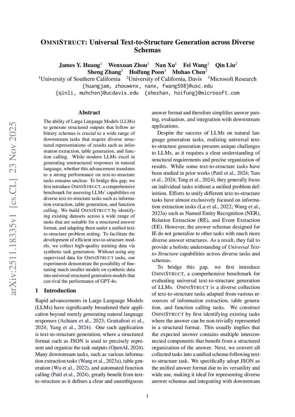 The ability of Large Language Models (LLMs) to generate structured outputs that follow arbitrary schemas is crucial to a wide range of downstream tasks that require diverse structured representations of results such as information extraction, table generation, and function calling. While modern LLMs excel in generating unstructured responses in natural language, whether this advancement translates to a strong performance on text-to-structure tasks remains unclear. To bridge this gap, we first introduce OmniStruct, a comprehensive benchmark for assessing LLMs' capabilities on diverse text-to-structure tasks such as information extraction, table generation, and function calling. We build OmniStruct by identifying existing datasets across a wide range of tasks that are suitable for a structured answer format, and adapting them under a unified text-to-structure problem setting. To facilitate the development of efficient text-to-structure models, we collect high-quality training data via synthetic task generation. Without using any supervised data for OmniStruct tasks, our experiments demonstrate the possibility of fine-tuning much smaller models on synthetic data into universal structured generation models that can rival the performance of GPT-4o.