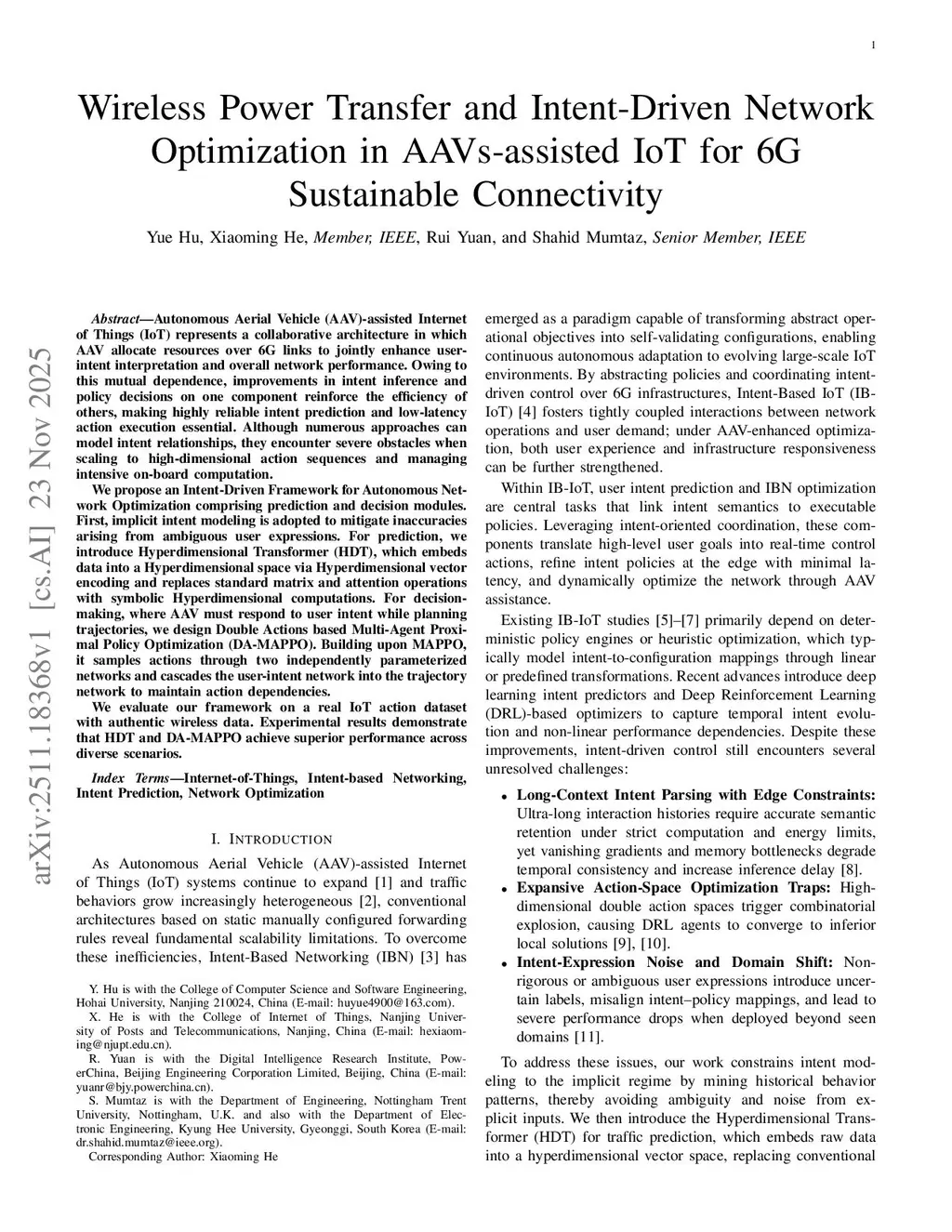 Autonomous Aerial Vehicle (AAV)-assisted Internet of Things (IoT) represents a collaborative architecture in which AAV allocate resources over 6G links to jointly enhance user-intent interpretation and overall network performance. Owing to this mutual dependence, improvements in intent inference and policy decisions on one component reinforce the efficiency of others, making highly reliable intent prediction and low-latency action execution essential. Although numerous approaches can model intent relationships, they encounter severe obstacles when scaling to high-dimensional action sequences and managing intensive on-board computation. We propose an Intent-Driven Framework for Autonomous Network Optimization comprising prediction and decision modules. First, implicit intent modeling is adopted to mitigate inaccuracies arising from ambiguous user expressions. For prediction, we introduce Hyperdimensional Transformer (HDT), which embeds data into a Hyperdimensional space via Hyperdimensional vector encoding and replaces standard matrix and attention operations with symbolic Hyperdimensional computations. For decision-making, where AAV must respond to user intent while planning trajectories, we design Double Actions based Multi-Agent Proximal Policy Optimization (DA-MAPPO). Building upon MAPPO, it samples actions through two independently parameterized networks and cascades the user-intent network into the trajectory network to maintain action dependencies. We evaluate our framework on a real IoT action dataset with authentic wireless data. Experimental results demonstrate that HDT and DA-MAPPO achieve superior performance across diverse scenarios.