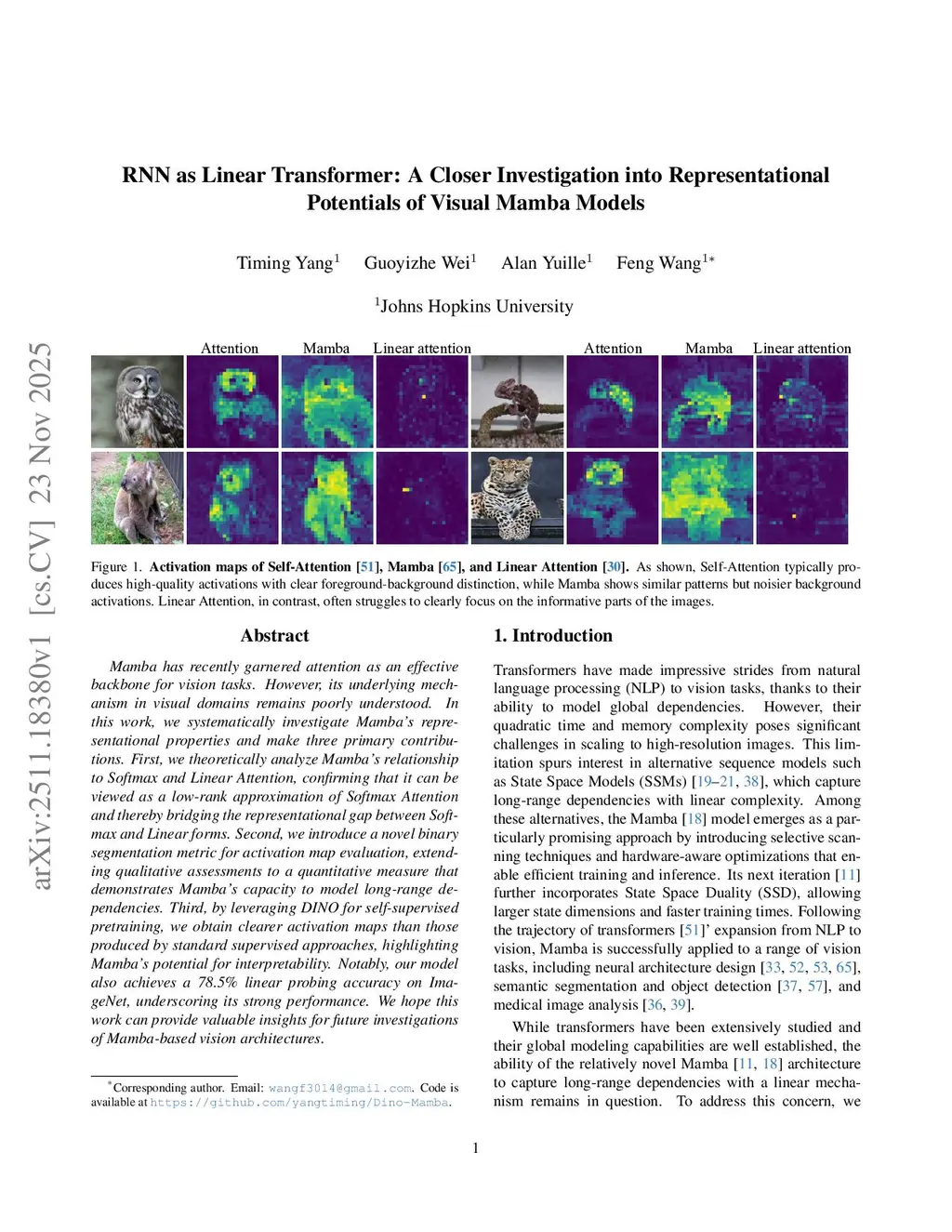 Mamba has recently garnered attention as an effective backbone for vision tasks. However, its underlying mechanism in visual domains remains poorly understood. In this work, we systematically investigate Mamba's representational properties and make three primary contributions. First, we theoretically analyze Mamba's relationship to Softmax and Linear Attention, confirming that it can be viewed as a low-rank approximation of Softmax Attention and thereby bridging the representational gap between Softmax and Linear forms. Second, we introduce a novel binary segmentation metric for activation map evaluation, extending qualitative assessments to a quantitative measure that demonstrates Mamba's capacity to model long-range dependencies. Third, by leveraging DINO for self-supervised pretraining, we obtain clearer activation maps than those produced by standard supervised approaches, highlighting Mamba's potential for interpretability. Notably, our model also achieves a 78.5 percent linear probing accuracy on ImageNet, underscoring its strong performance. We hope this work can provide valuable insights for future investigations of Mamba-based vision architectures.