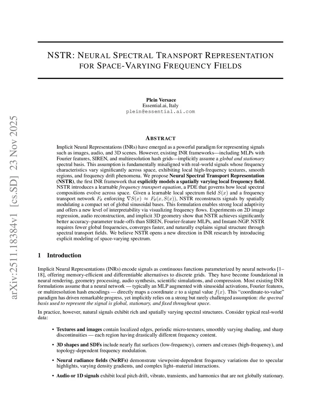 Implicit Neural Representations (INRs) have emerged as a powerful paradigm for representing signals such as images, audio, and 3D scenes. However, existing INR frameworks -- including MLPs with Fourier features, SIREN, and multiresolution hash grids -- implicitly assume a \textit{global and stationary} spectral basis. This assumption is fundamentally misaligned with real-world signals whose frequency characteristics vary significantly across space, exhibiting local high-frequency textures, smooth regions, and frequency drift phenomena. We propose \textbf{Neural Spectral Transport Representation (NSTR)}, the first INR framework that \textbf{explicitly models a spatially varying local frequency field}. NSTR introduces a learnable \emph{frequency transport equation}, a PDE that governs how local spectral compositions evolve across space. Given a learnable local spectrum field and a frequency transport network enforcing , NSTR reconstructs signals by spatially modulating a compact set of global sinusoidal bases. This formulation enables strong local adaptivity and offers a new level of interpretability via visualizing frequency flows. Experiments on 2D image regression, audio reconstruction, and implicit 3D geometry show that NSTR achieves significantly better accuracy-parameter trade-offs than SIREN, Fourier-feature MLPs, and Instant-NGP. NSTR requires fewer global frequencies, converges faster, and naturally explains signal structure through spectral transport fields. We believe NSTR opens a new direction in INR research by introducing explicit modeling of space-varying spectrum.