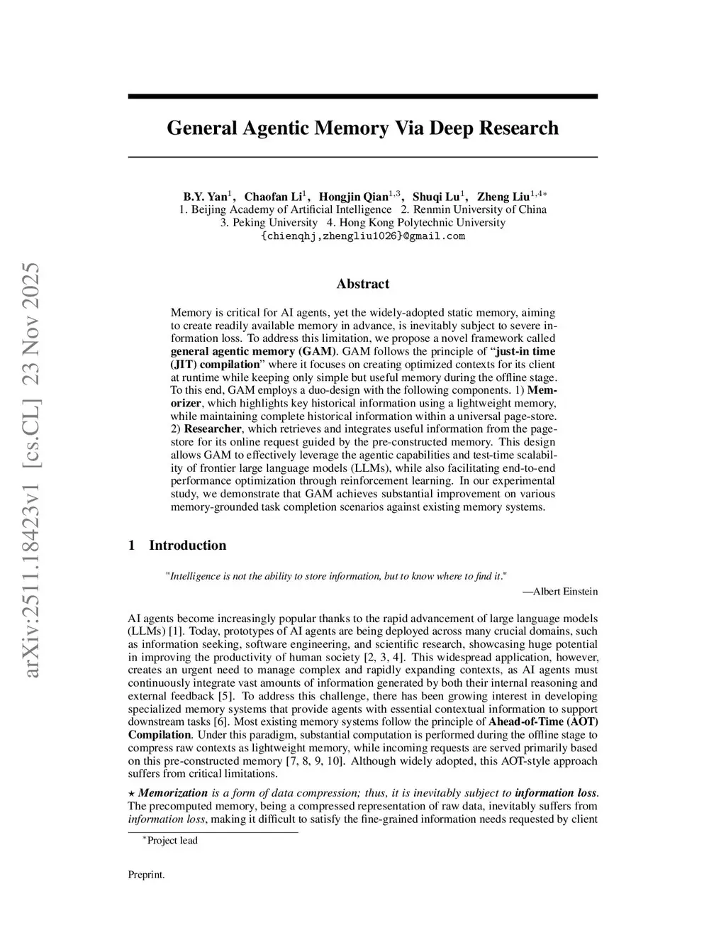 Memory is critical for AI agents, yet the widely-adopted static memory, aiming to create readily available memory in advance, is inevitably subject to severe information loss. To address this limitation, we propose a novel framework called \textbf{general agentic memory (GAM)}. GAM follows the principle of "\textbf{just-in time (JIT) compilation}" where it focuses on creating optimized contexts for its client at runtime while keeping only simple but useful memory during the offline stage. To this end, GAM employs a duo-design with the following components. 1) \textbf{Memorizer}, which highlights key historical information using a lightweight memory, while maintaining complete historical information within a universal page-store. 2) \textbf{Researcher}, which retrieves and integrates useful information from the page-store for its online request guided by the pre-constructed memory. This design allows GAM to effectively leverage the agentic capabilities and test-time scalability of frontier large language models (LLMs), while also facilitating end-to-end performance optimization through reinforcement learning. In our experimental study, we demonstrate that GAM achieves substantial improvement on various memory-grounded task completion scenarios against existing memory systems.