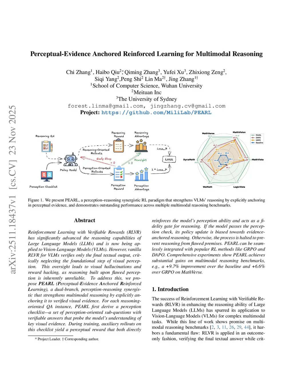 Reinforcement Learning with Verifiable Rewards (RLVR) has significantly advanced the reasoning capabilities of Large Language Models (LLMs) and is now being applied to Vision-Language Models (VLMs). However, vanilla RLVR for VLMs verifies only the final textual output, critically neglecting the foundational step of visual perception. This oversight leads to visual hallucinations and reward hacking, as reasoning built upon flawed perception is inherently unreliable. To address this, we propose PEARL (Perceptual-Evidence Anchored Reinforced Learning), a dual-branch, perception-reasoning synergistic that strengthens multimodal reasoning by explicitly anchoring it to verified visual evidence. For each reasoning-oriented QA instance, PEARL first derive a perception checklist -- a set of perception-oriented sub-questions with verifiable answers that probe the model's understanding of key visual evidence. During training, auxiliary rollouts on this checklist yield a perceptual reward that both directly reinforces the model's perception ability and acts as a fidelity gate for reasoning. If the model passes the perception check, its policy update is biased towards evidence-anchored reasoning. Otherwise, the process is halted to prevent reasoning from flawed premises. PEARL can be seamlessly integrated with popular RL methods like GRPO and DAPO. Comprehensive experiments show PEARL achieves substantial gains on multimodal reasoning benchmarks, e.g., a +9.7% improvement over the baseline and +6.6% over GRPO on MathVerse.