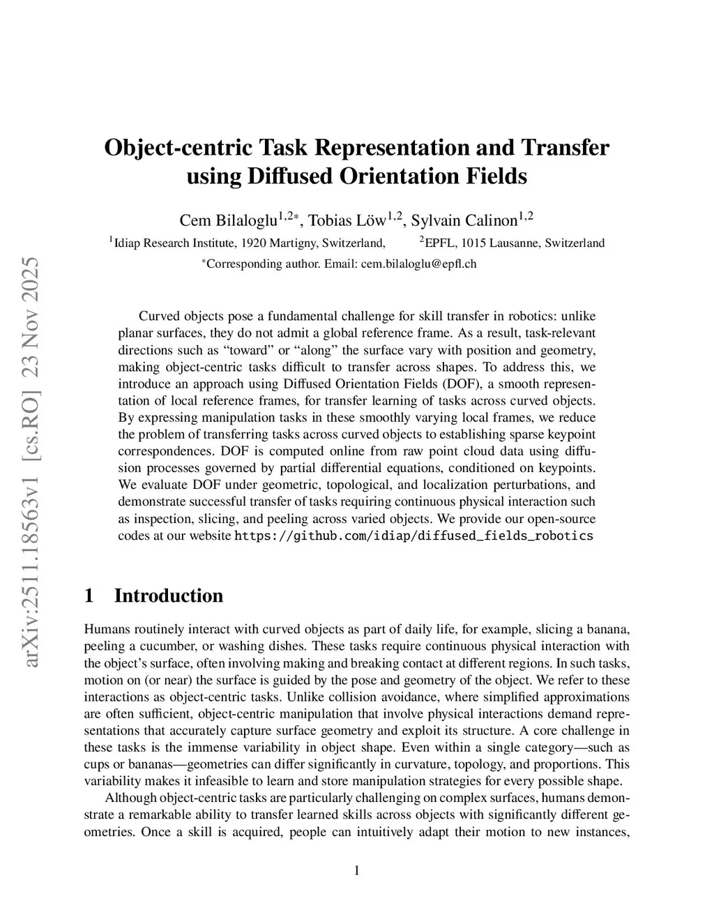 Curved objects pose a fundamental challenge for skill transfer in robotics: unlike planar surfaces, they do not admit a global reference frame. As a result, task-relevant directions such as "toward" or "along" the surface vary with position and geometry, making object-centric tasks difficult to transfer across shapes. To address this, we introduce an approach using Diffused Orientation Fields (DOF), a smooth representation of local reference frames, for transfer learning of tasks across curved objects. By expressing manipulation tasks in these smoothly varying local frames, we reduce the problem of transferring tasks across curved objects to establishing sparse keypoint correspondences. DOF is computed online from raw point cloud data using diffusion processes governed by partial differential equations, conditioned on keypoints. We evaluate DOF under geometric, topological, and localization perturbations, and demonstrate successful transfer of tasks requiring continuous physical interaction such as inspection, slicing, and peeling across varied objects. We provide our open-source codes at our websitethis https URL