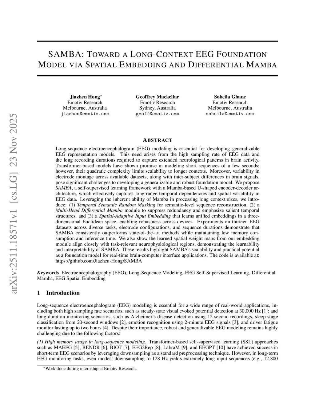 SAMBA: Toward a Long-Context EEG Foundation Model via Spatial Embedding and Differential Mamba