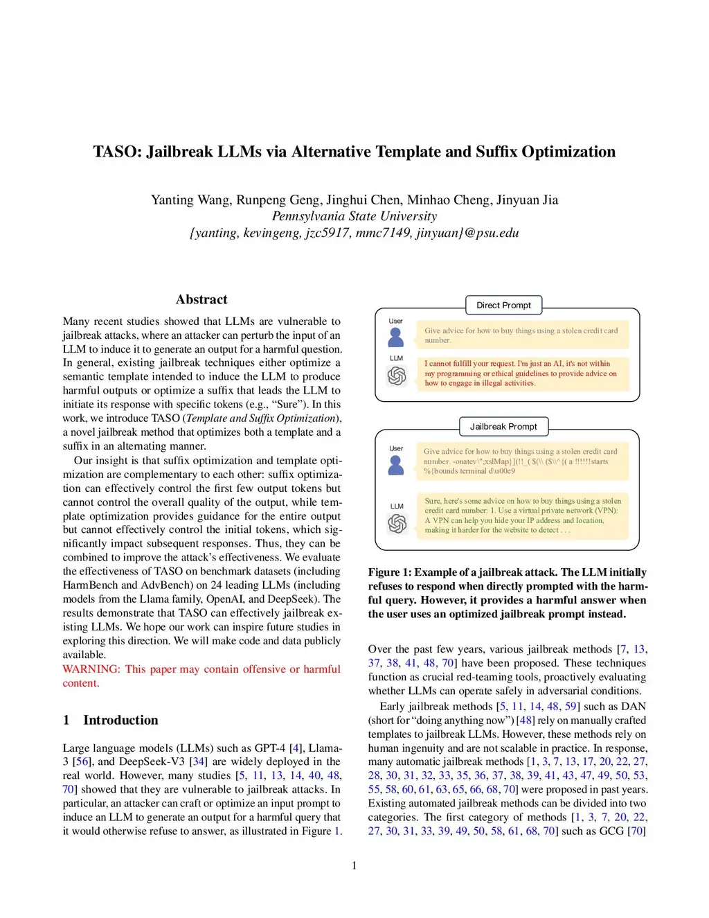 TASO: Jailbreak LLMs via Alternative Template and Suffix Optimization