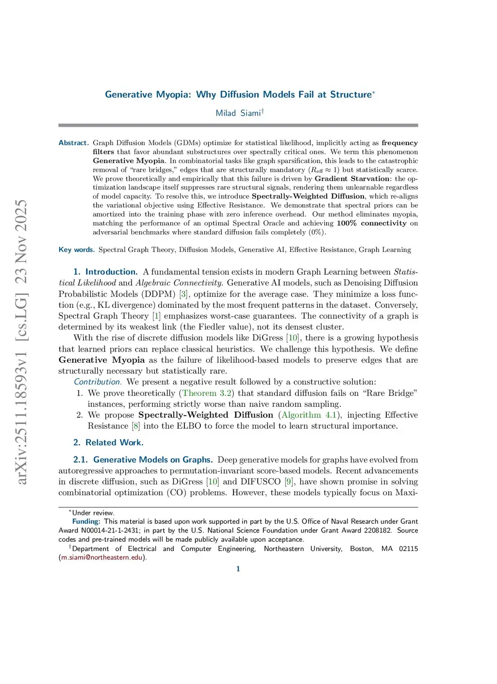 Graph Diffusion Models (GDMs) optimize for statistical likelihood, implicitly acting as \textbf{frequency filters} that favor abundant substructures over spectrally critical ones. We term this phenomenon \textbf{Generative Myopia}. In combinatorial tasks like graph sparsification, this leads to the catastrophic removal of ``rare bridges,'' edges that are structurally mandatory () but statistically scarce. We prove theoretically and empirically that this failure is driven by \textbf{Gradient Starvation}: the optimization landscape itself suppresses rare structural signals, rendering them unlearnable regardless of model capacity. To resolve this, we introduce \textbf{Spectrally-Weighted Diffusion}, which re-aligns the variational objective using Effective Resistance. We demonstrate that spectral priors can be amortized into the training phase with zero inference overhead. Our method eliminates myopia, matching the performance of an optimal Spectral Oracle and achieving \textbf{100\% connectivity} on adversarial benchmarks where standard diffusion fails completely (0\%).