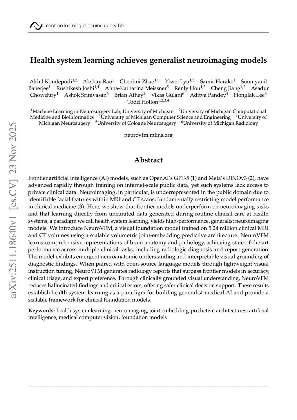 Frontier artificial intelligence (AI) models, such as OpenAI's GPT-5 and Meta's DINOv3, have advanced rapidly through training on internet-scale public data, yet such systems lack access to private clinical data. Neuroimaging, in particular, is underrepresented in the public domain due to identifiable facial features within MRI and CT scans, fundamentally restricting model performance in clinical medicine. Here, we show that frontier models underperform on neuroimaging tasks and that learning directly from uncurated data generated during routine clinical care at health systems, a paradigm we call health system learning, yields high-performance, generalist neuroimaging models. We introduce NeuroVFM, a visual foundation model trained on 5.24 million clinical MRI and CT volumes using a scalable volumetric joint-embedding predictive architecture. NeuroVFM learns comprehensive representations of brain anatomy and pathology, achieving state-of-the-art performance across multiple clinical tasks, including radiologic diagnosis and report generation. The model exhibits emergent neuroanatomic understanding and interpretable visual grounding of diagnostic findings. When paired with open-source language models through lightweight visual instruction tuning, NeuroVFM generates radiology reports that surpass frontier models in accuracy, clinical triage, and expert preference. Through clinically grounded visual understanding, NeuroVFM reduces hallucinated findings and critical errors, offering safer clinical decision support. These results establish health system learning as a paradigm for building generalist medical AI and provide a scalable framework for clinical foundation models.