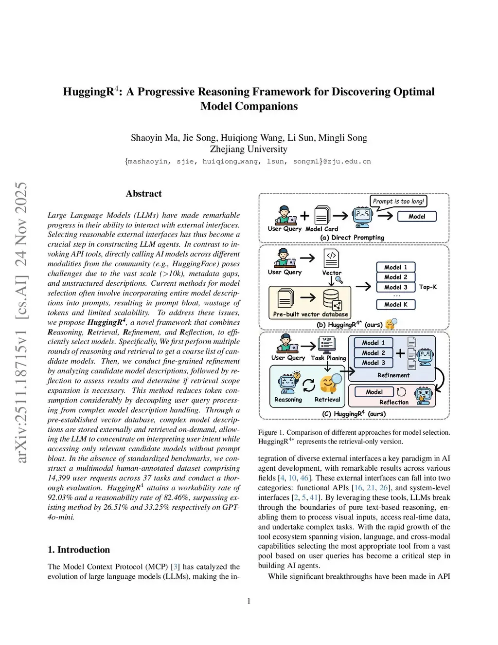 Large Language Models (LLMs) have made remarkable progress in their ability to interact with external interfaces. Selecting reasonable external interfaces has thus become a crucial step in constructing LLM agents. In contrast to invoking API tools, directly calling AI models across different modalities from the community (e.g., HuggingFace) poses challenges due to the vast scale (> 10k), metadata gaps, and unstructured descriptions. Current methods for model selection often involve incorporating entire model descriptions into prompts, resulting in prompt bloat, wastage of tokens and limited scalability. To address these issues, we propose HuggingR, a novel framework that combines Reasoning, Retrieval, Refinement, and Reflection, to efficiently select models. Specifically, We first perform multiple rounds of reasoning and retrieval to get a coarse list of candidate models. Then, we conduct fine-grained refinement by analyzing candidate model descriptions, followed by reflection to assess results and determine if retrieval scope expansion is necessary. This method reduces token consumption considerably by decoupling user query processing from complex model description handling. Through a pre-established vector database, complex model descriptions are stored externally and retrieved on-demand, allowing the LLM to concentrate on interpreting user intent while accessing only relevant candidate models without prompt bloat. In the absence of standardized benchmarks, we construct a multimodal human-annotated dataset comprising 14,399 user requests across 37 tasks and conduct a thorough evaluation. HuggingR attains a workability rate of 92.03% and a reasonability rate of 82.46%, surpassing existing method by 26.51% and 33.25% respectively on GPT-4o-mini.