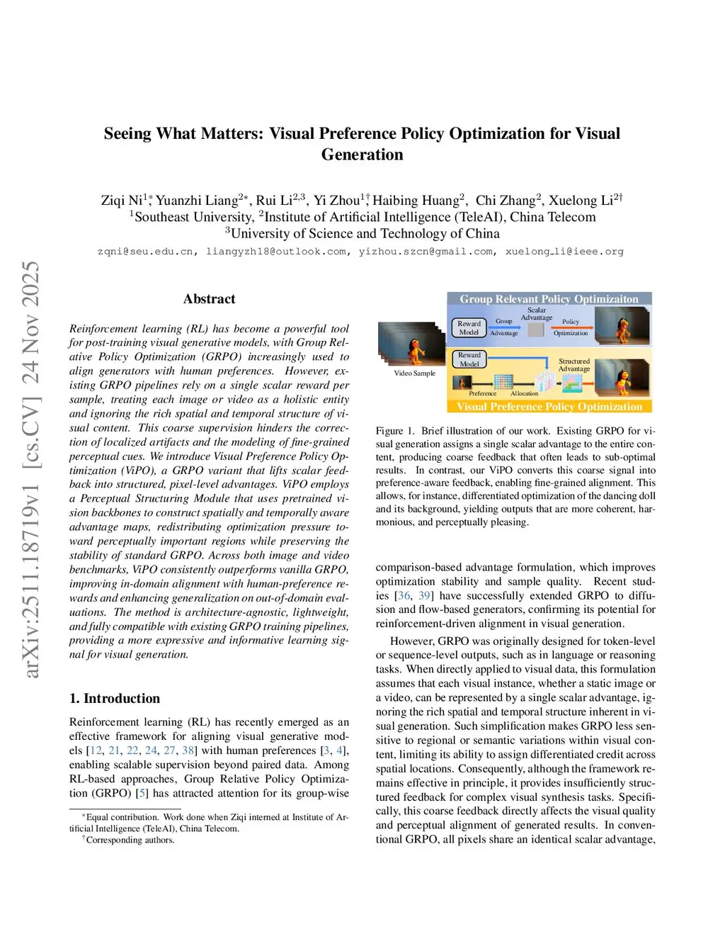 Reinforcement learning (RL) has become a powerful tool for post-training visual generative models, with Group Relative Policy Optimization (GRPO) increasingly used to align generators with human preferences. However, existing GRPO pipelines rely on a single scalar reward per sample, treating each image or video as a holistic entity and ignoring the rich spatial and temporal structure of visual content. This coarse supervision hinders the correction of localized artifacts and the modeling of fine-grained perceptual cues. We introduce Visual Preference Policy Optimization (ViPO), a GRPO variant that lifts scalar feedback into structured, pixel-level advantages. ViPO employs a Perceptual Structuring Module that uses pretrained vision backbones to construct spatially and temporally aware advantage maps, redistributing optimization pressure toward perceptually important regions while preserving the stability of standard GRPO. Across both image and video benchmarks, ViPO consistently outperforms vanilla GRPO, improving in-domain alignment with human-preference rewards and enhancing generalization on out-of-domain evaluations. The method is architecture-agnostic, lightweight, and fully compatible with existing GRPO training pipelines, providing a more expressive and informative learning signal for visual generation.