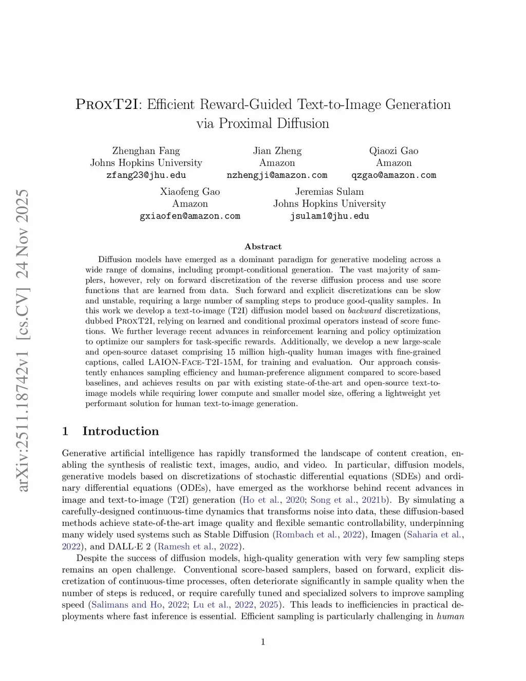 Diffusion models have emerged as a dominant paradigm for generative modeling across a wide range of domains, including prompt-conditional generation. The vast majority of samplers, however, rely on forward discretization of the reverse diffusion process and use score functions that are learned from data. Such forward and explicit discretizations can be slow and unstable, requiring a large number of sampling steps to produce good-quality samples. In this work we develop a text-to-image (T2I) diffusion model based on backward discretizations, dubbed ProxT2I, relying on learned and conditional proximal operators instead of score functions. We further leverage recent advances in reinforcement learning and policy optimization to optimize our samplers for task-specific rewards. Additionally, we develop a new large-scale and open-source dataset comprising 15 million high-quality human images with fine-grained captions, called LAION-Face-T2I-15M, for training and evaluation. Our approach consistently enhances sampling efficiency and human-preference alignment compared to score-based baselines, and achieves results on par with existing state-of-the-art and open-source text-to-image models while requiring lower compute and smaller model size, offering a lightweight yet performant solution for human text-to-image generation.