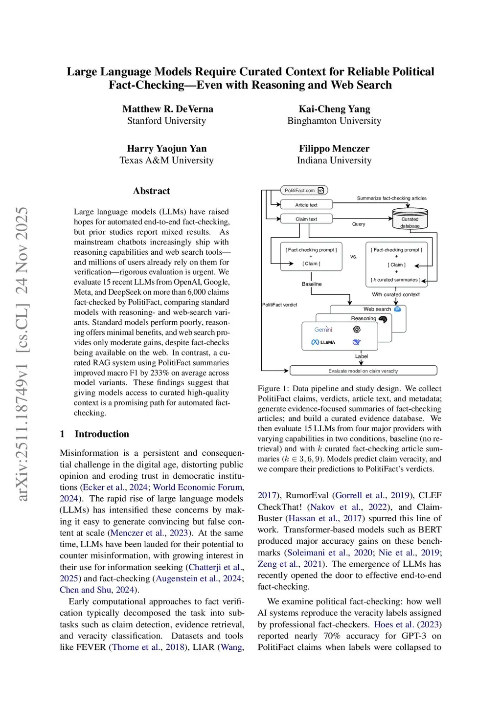 Large Language Models Require Curated Context for Reliable Political Fact-Checking -- Even with Reasoning and Web Search