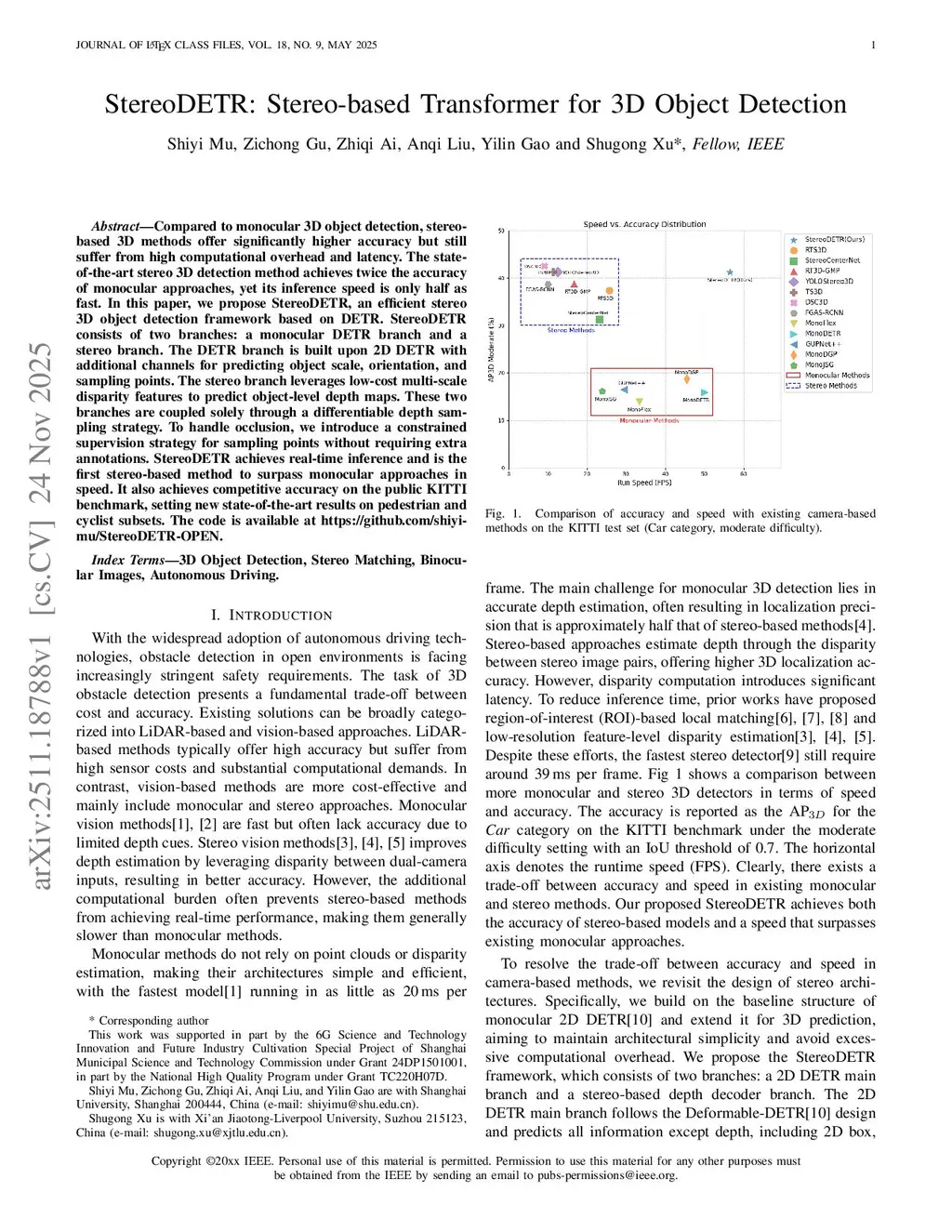 Compared to monocular 3D object detection, stereo-based 3D methods offer significantly higher accuracy but still suffer from high computational overhead and latency. The state-of-the-art stereo 3D detection method achieves twice the accuracy of monocular approaches, yet its inference speed is only half as fast. In this paper, we propose StereoDETR, an efficient stereo 3D object detection framework based on DETR. StereoDETR consists of two branches: a monocular DETR branch and a stereo branch. The DETR branch is built upon 2D DETR with additional channels for predicting object scale, orientation, and sampling points. The stereo branch leverages low-cost multi-scale disparity features to predict object-level depth maps. These two branches are coupled solely through a differentiable depth sampling strategy. To handle occlusion, we introduce a constrained supervision strategy for sampling points without requiring extra annotations. StereoDETR achieves real-time inference and is the first stereo-based method to surpass monocular approaches in speed. It also achieves competitive accuracy on the public KITTI benchmark, setting new state-of-the-art results on pedestrian and cyclist subsets. The code is available atthis https URL.