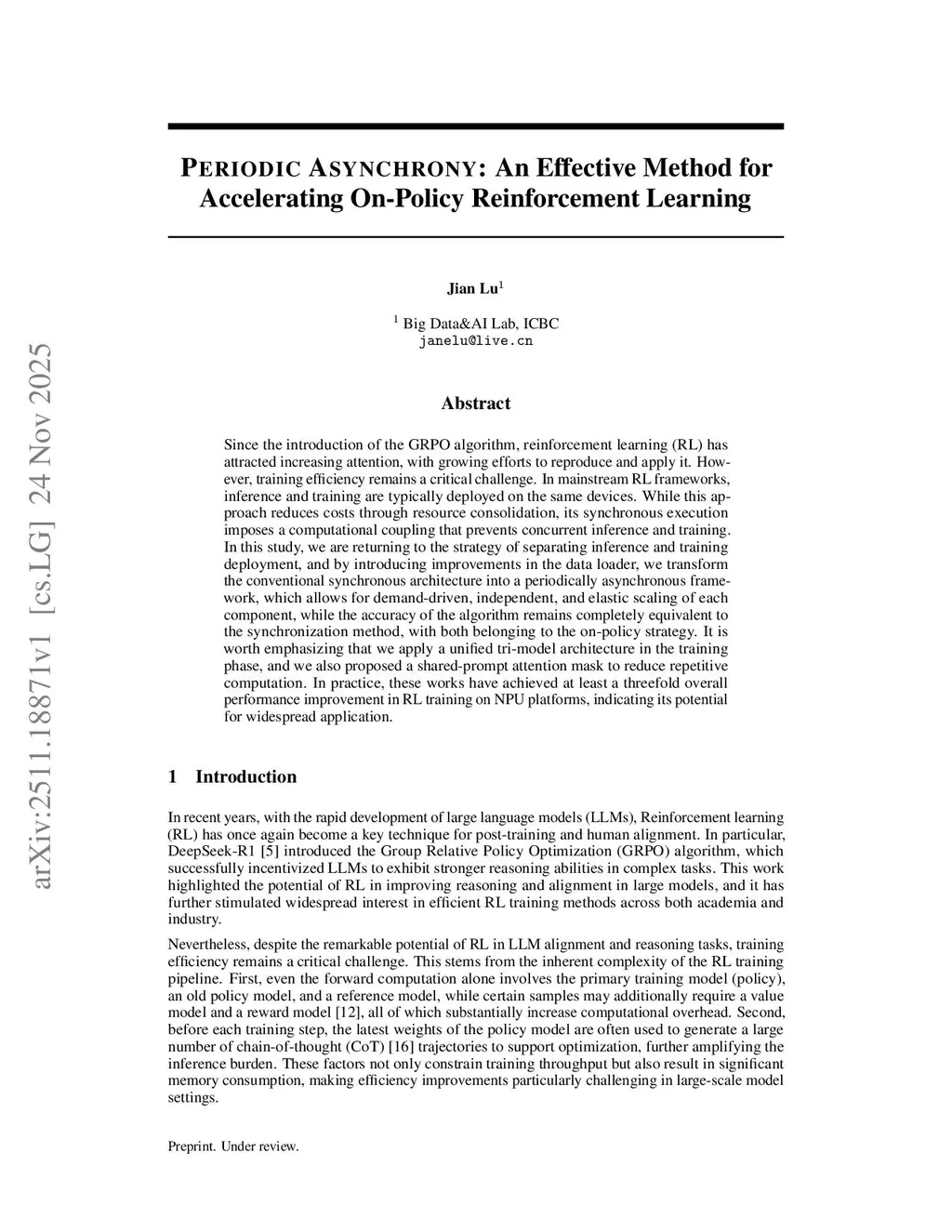 Since the introduction of the GRPO algorithm, reinforcement learning (RL) has attracted increasing attention, with growing efforts to reproduce and apply it. However, training efficiency remains a critical challenge. In mainstream RL frameworks, inference and training are typically deployed on the same devices. While this approach reduces costs through resource consolidation, its synchronous execution imposes a computational coupling that prevents concurrent inference and training. In this study, we are returning to the strategy of separating inference and training deployment, and by introducing improvements in the data loader, we transform the conventional synchronous architecture into a periodically asynchronous framework, which allows for demand-driven, independent, and elastic scaling of each component, while the accuracy of the algorithm remains completely equivalent to the synchronization method, with both belonging to the on-policy strategy. It is worth emphasizing that we apply a unified tri-model architecture in the training phase, and we also proposed a shared-prompt attention mask to reduce repetitive computation. In practice, our approach consistently delivers significant end-to-end training efficiency improvements on NPU platforms, indicating its potential for widespread application.