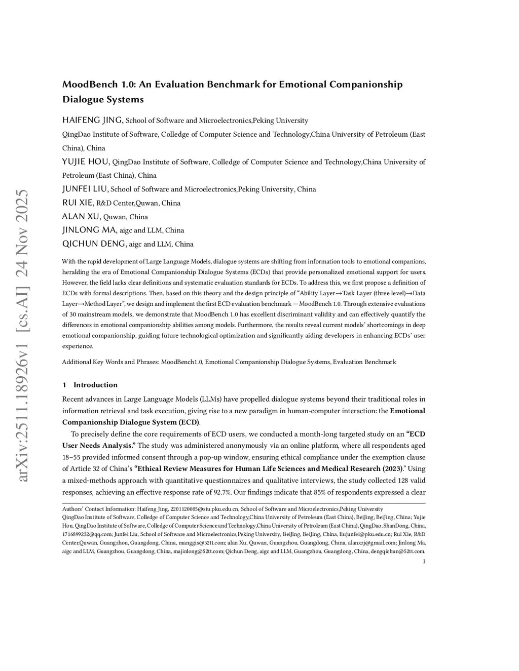 With the rapid development of Large Language Models, dialogue systems are shifting from information tools to emotional companions, heralding the era of Emotional Companionship Dialogue Systems (ECDs) that provide personalized emotional support for users. However, the field lacks clear definitions and systematic evaluation standards for ECDs. To address this, we first propose a definition of ECDs with formal descriptions. Then, based on this theory and the design principle of "Ability Layer-Task Layer (three level)-Data Layer-Method Layer", we design and implement the first ECD evaluation benchmark - MoodBench 1.0. Through extensive evaluations of 30 mainstream models, we demonstrate that MoodBench 1.0 has excellent discriminant validity and can effectively quantify the differences in emotional companionship abilities among models. Furthermore, the results reveal current models' shortcomings in deep emotional companionship, guiding future technological optimization and significantly aiding developers in enhancing ECDs' user experience.