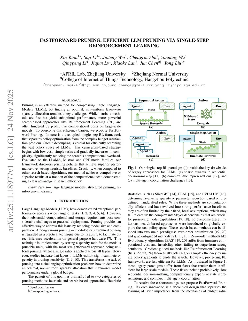 FastForward Pruning: Efficient LLM Pruning via Single-Step Reinforcement Learning