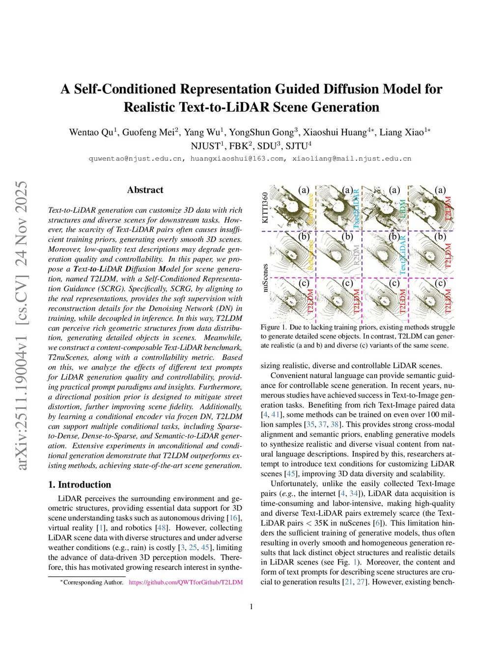 Text-to-LiDAR generation can customize 3D data with rich structures and diverse scenes for downstream tasks. However, the scarcity of Text-LiDAR pairs often causes insufficient training priors, generating overly smooth 3D scenes. Moreover, low-quality text descriptions may degrade generation quality and controllability. In this paper, we propose a Text-to-LiDAR Diffusion Model for scene generation, named T2LDM, with a Self-Conditioned Representation Guidance (SCRG). Specifically, SCRG, by aligning to the real representations, provides the soft supervision with reconstruction details for the Denoising Network (DN) in training, while decoupled in inference. In this way, T2LDM can perceive rich geometric structures from data distribution, generating detailed objects in scenes. Meanwhile, we construct a content-composable Text-LiDAR benchmark, T2nuScenes, along with a controllability metric. Based on this, we analyze the effects of different text prompts for LiDAR generation quality and controllability, providing practical prompt paradigms and insights. Furthermore, a directional position prior is designed to mitigate street distortion, further improving scene fidelity. Additionally, by learning a conditional encoder via frozen DN, T2LDM can support multiple conditional tasks, including Sparse-to-Dense, Dense-to-Sparse, and Semantic-to-LiDAR generation. Extensive experiments in unconditional and conditional generation demonstrate that T2LDM outperforms existing methods, achieving state-of-the-art scene generation.
