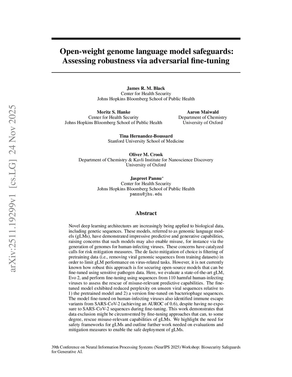 Open-weight genome language model safeguards: Assessing robustness via adversarial fine-tuning