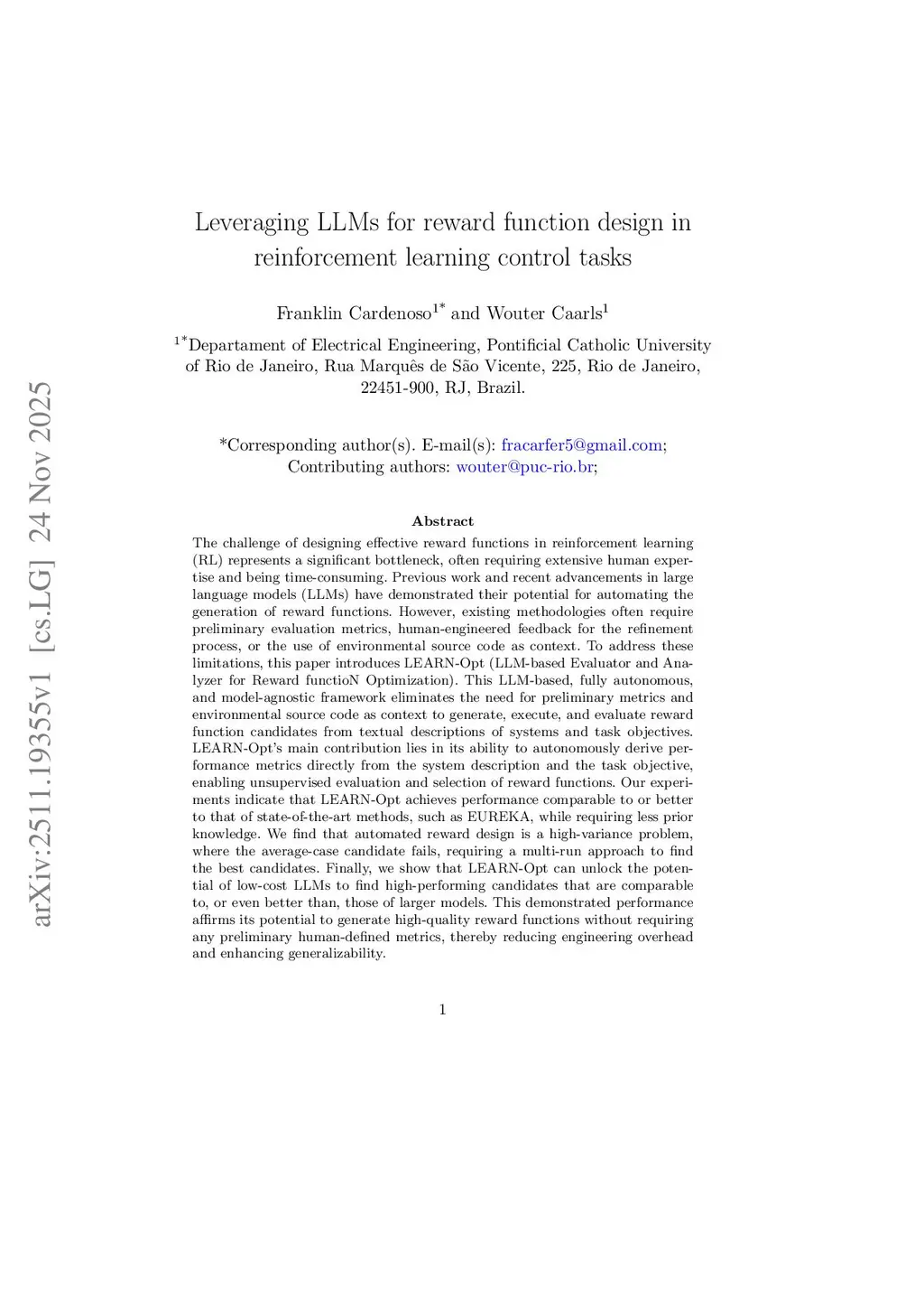 Leveraging LLMs for reward function design in reinforcement learning control tasks
