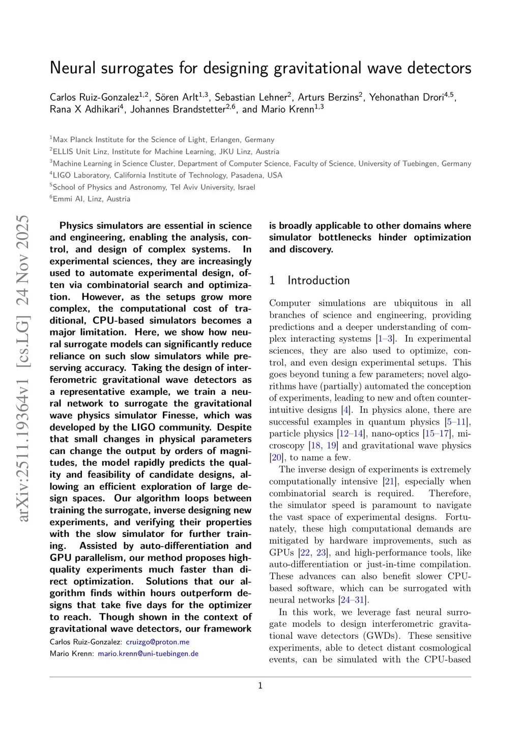 Physics simulators are essential in science and engineering, enabling the analysis, control, and design of complex systems. In experimental sciences, they are increasingly used to automate experimental design, often via combinatorial search and optimization. However, as the setups grow more complex, the computational cost of traditional, CPU-based simulators becomes a major limitation. Here, we show how neural surrogate models can significantly reduce reliance on such slow simulators while preserving accuracy. Taking the design of interferometric gravitational wave detectors as a representative example, we train a neural network to surrogate the gravitational wave physics simulator Finesse, which was developed by the LIGO community. Despite that small changes in physical parameters can change the output by orders of magnitudes, the model rapidly predicts the quality and feasibility of candidate designs, allowing an efficient exploration of large design spaces. Our algorithm loops between training the surrogate, inverse designing new experiments, and verifying their properties with the slow simulator for further training. Assisted by auto-differentiation and GPU parallelism, our method proposes high-quality experiments much faster than direct optimization. Solutions that our algorithm finds within hours outperform designs that take five days for the optimizer to reach. Though shown in the context of gravitational wave detectors, our framework is broadly applicable to other domains where simulator bottlenecks hinder optimization and discovery.