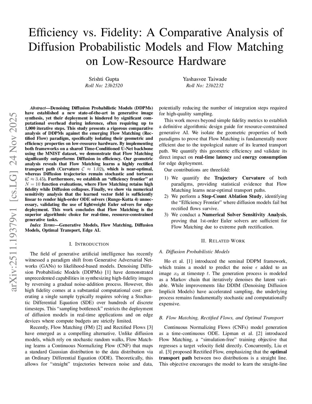 Denoising Diffusion Probabilistic Models (DDPMs) have established a new state-of-the-art in generative image synthesis, yet their deployment is hindered by significant computational overhead during inference, often requiring up to 1,000 iterative steps. This study presents a rigorous comparative analysis of DDPMs against the emerging Flow Matching (Rectified Flow) paradigm, specifically isolating their geometric and efficiency properties on low-resource hardware. By implementing both frameworks on a shared Time-Conditioned U-Net backbone using the MNIST dataset, we demonstrate that Flow Matching significantly outperforms Diffusion in efficiency. Our geometric analysis reveals that Flow Matching learns a highly rectified transport path (Curvature ), which is near-optimal, whereas Diffusion trajectories remain stochastic and tortuous (). Furthermore, we establish an ``efficiency frontier'' at function evaluations, where Flow Matching retains high fidelity while Diffusion collapses. Finally, we show via numerical sensitivity analysis that the learned vector field is sufficiently linear to render high-order ODE solvers (Runge-Kutta 4) unnecessary, validating the use of lightweight Euler solvers for edge deployment. \textbf{This work concludes that Flow Matching is the superior algorithmic choice for real-time, resource-constrained generative tasks.}