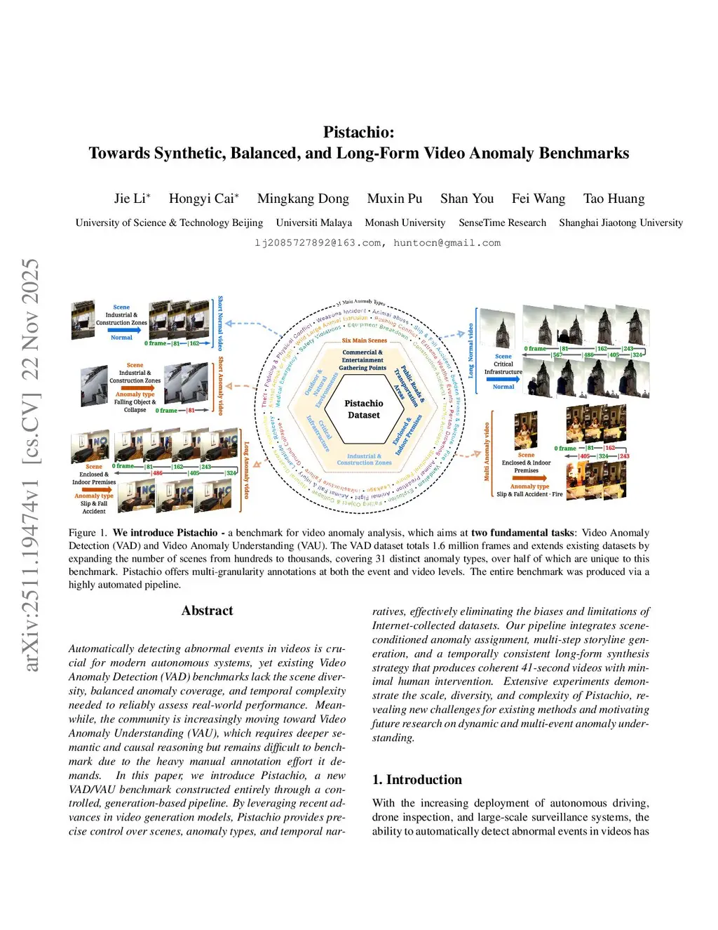 Automatically detecting abnormal events in videos is crucial for modern autonomous systems, yet existing Video Anomaly Detection (VAD) benchmarks lack the scene diversity, balanced anomaly coverage, and temporal complexity needed to reliably assess real-world performance. Meanwhile, the community is increasingly moving toward Video Anomaly Understanding (VAU), which requires deeper semantic and causal reasoning but remains difficult to benchmark due to the heavy manual annotation effort it demands. In this paper, we introduce Pistachio, a new VAD/VAU benchmark constructed entirely through a controlled, generation-based pipeline. By leveraging recent advances in video generation models, Pistachio provides precise control over scenes, anomaly types, and temporal narratives, effectively eliminating the biases and limitations of Internet-collected datasets. Our pipeline integrates scene-conditioned anomaly assignment, multi-step storyline generation, and a temporally consistent long-form synthesis strategy that produces coherent 41-second videos with minimal human intervention. Extensive experiments demonstrate the scale, diversity, and complexity of Pistachio, revealing new challenges for existing methods and motivating future research on dynamic and multi-event anomaly understanding.