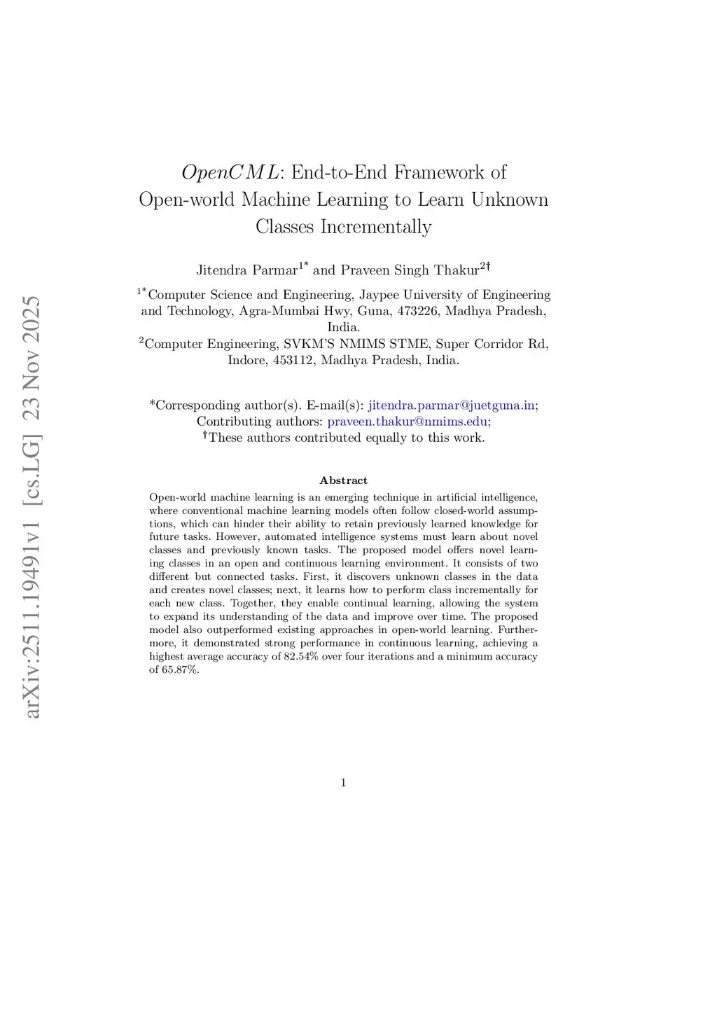 Open-world machine learning is an emerging technique in artificial intelligence, where conventional machine learning models often follow closed-world assumptions, which can hinder their ability to retain previously learned knowledge for future tasks. However, automated intelligence systems must learn about novel classes and previously known tasks. The proposed model offers novel learning classes in an open and continuous learning environment. It consists of two different but connected tasks. First, it discovers unknown classes in the data and creates novel classes; next, it learns how to perform class incrementally for each new class. Together, they enable continual learning, allowing the system to expand its understanding of the data and improve over time. The proposed model also outperformed existing approaches in open-world learning. Furthermore, it demonstrated strong performance in continuous learning, achieving a highest average accuracy of 82.54% over four iterations and a minimum accuracy of 65.87%.