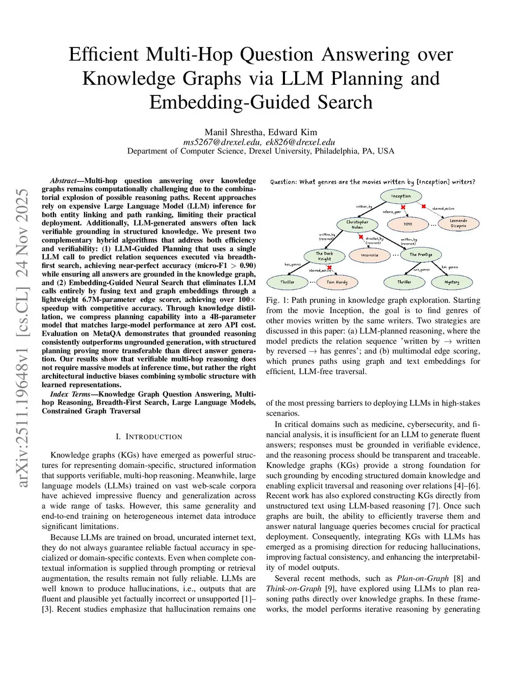 Multi-hop question answering over knowledge graphs remains computationally challenging due to the combinatorial explosion of possible reasoning paths. Recent approaches rely on expensive Large Language Model (LLM) inference for both entity linking and path ranking, limiting their practical deployment. Additionally, LLM-generated answers often lack verifiable grounding in structured knowledge. We present two complementary hybrid algorithms that address both efficiency and verifiability: (1) LLM-Guided Planning that uses a single LLM call to predict relation sequences executed via breadth-first search, achieving near-perfect accuracy (micro-F1 > 0.90) while ensuring all answers are grounded in the knowledge graph, and (2) Embedding-Guided Neural Search that eliminates LLM calls entirely by fusing text and graph embeddings through a lightweight 6.7M-parameter edge scorer, achieving over 100 times speedup with competitive accuracy. Through knowledge distillation, we compress planning capability into a 4B-parameter model that matches large-model performance at zero API cost. Evaluation on MetaQA demonstrates that grounded reasoning consistently outperforms ungrounded generation, with structured planning proving more transferable than direct answer generation. Our results show that verifiable multi-hop reasoning does not require massive models at inference time, but rather the right architectural inductive biases combining symbolic structure with learned representations.