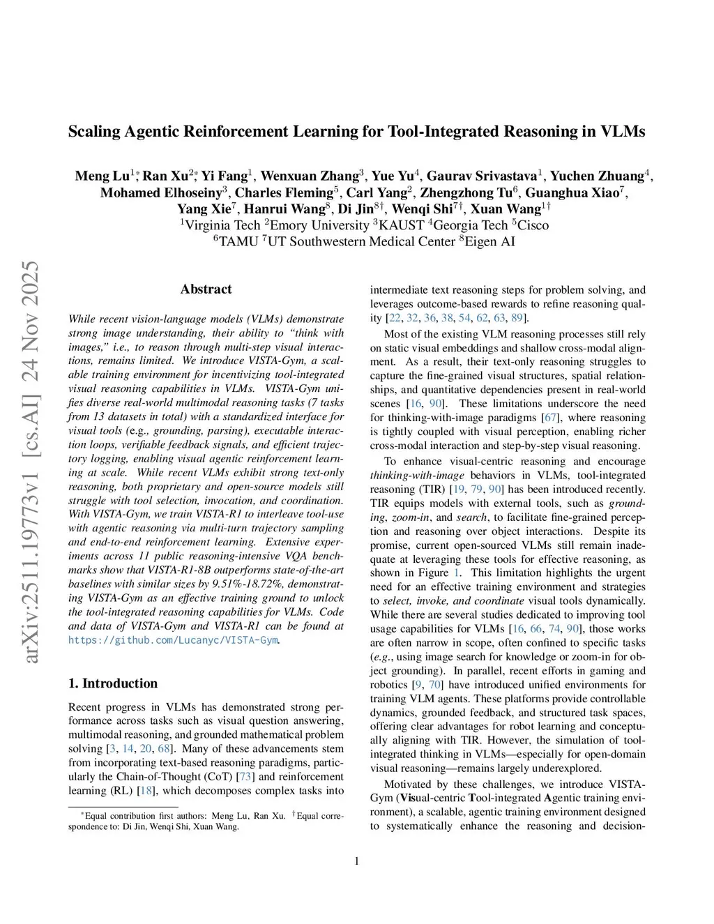 While recent vision-language models (VLMs) demonstrate strong image understanding, their ability to "think with images", i.e., to reason through multi-step visual interactions, remains limited. We introduce VISTA-Gym, a scalable training environment for incentivizing tool-integrated visual reasoning capabilities in VLMs. VISTA-Gym unifies diverse real-world multimodal reasoning tasks (7 tasks from 13 datasets in total) with a standardized interface for visual tools (e.g., grounding, parsing), executable interaction loops, verifiable feedback signals, and efficient trajectory logging, enabling visual agentic reinforcement learning at scale. While recent VLMs exhibit strong text-only reasoning, both proprietary and open-source models still struggle with tool selection, invocation, and coordination. With VISTA-Gym, we train VISTA-R1 to interleave tool-use with agentic reasoning via multi-turn trajectory sampling and end-to-end reinforcement learning. Extensive experiments across 11 public reasoning-intensive VQA benchmarks show that VISTA-R1-8B outperforms state-of-the-art baselines with similar sizes by 9.51%-18.72%, demonstrating VISTA-Gym as an effective training ground to unlock the tool-integrated reasoning capabilities for VLMs.