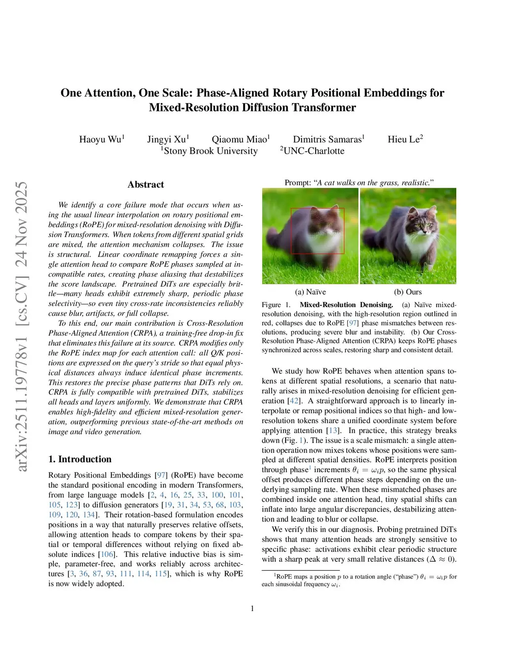 We identify a core failure mode that occurs when using the usual linear interpolation on rotary positional embeddings (RoPE) for mixed-resolution denoising with Diffusion Transformers. When tokens from different spatial grids are mixed, the attention mechanism collapses. The issue is structural. Linear coordinate remapping forces a single attention head to compare RoPE phases sampled at incompatible rates, creating phase aliasing that destabilizes the score landscape. Pretrained DiTs are especially brittle-many heads exhibit extremely sharp, periodic phase selectivity-so even tiny cross-rate inconsistencies reliably cause blur, artifacts, or full collapse.To this end, our main contribution is Cross-Resolution Phase-Aligned Attention (CRPA), a training-free drop-in fix that eliminates this failure at its source. CRPA modifies only the RoPE index map for each attention call: all Q/K positions are expressed on the query's stride so that equal physical distances always induce identical phase increments. This restores the precise phase patterns that DiTs rely on. CRPA is fully compatible with pretrained DiTs, stabilizes all heads and layers uniformly. We demonstrate that CRPA enables high-fidelity and efficient mixed-resolution generation, outperforming previous state-of-the-art methods on image and video generation.