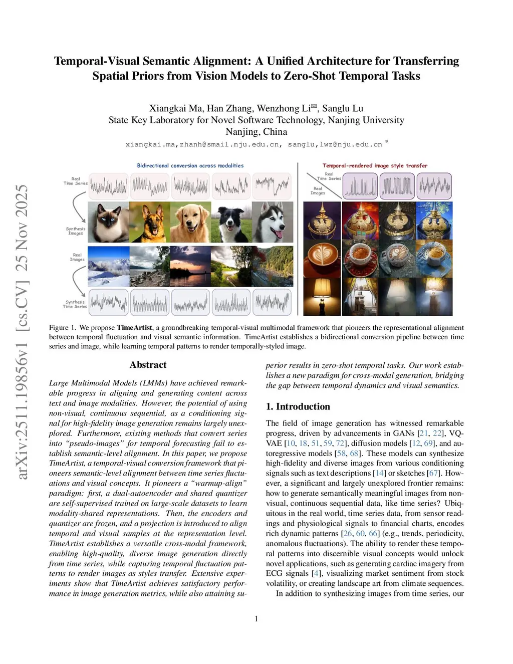 Large Multimodal Models (LMMs) have achieved remarkable progress in aligning and generating content across text and image modalities. However, the potential of using non-visual, continuous sequential, as a conditioning signal for high-fidelity image generation remains largely unexplored. Furthermore, existing methods that convert series into "pseudo-images" for temporal forecasting fail to establish semantic-level alignment. In this paper, we propose TimeArtist, a temporal-visual conversion framework that pioneers semantic-level alignment between time series fluctuations and visual concepts. It pioneers a "warmup-align" paradigm: first, a dual-autoencoder and shared quantizer are self-supervised trained on large-scale datasets to learn modality-shared representations. Then, the encoders and quantizer are frozen, and a projection is introduced to align temporal and visual samples at the representation level. TimeArtist establishes a versatile cross-modal framework, enabling high-quality, diverse image generation directly from time series, while capturing temporal fluctuation patterns to render images as styles transfer. Extensive experiments show that TimeArtist achieves satisfactory performance in image generation metrics, while also attaining superior results in zero-shot temporal tasks. Our work establishes a new paradigm for cross-modal generation, bridging the gap between temporal dynamics and visual semantics.