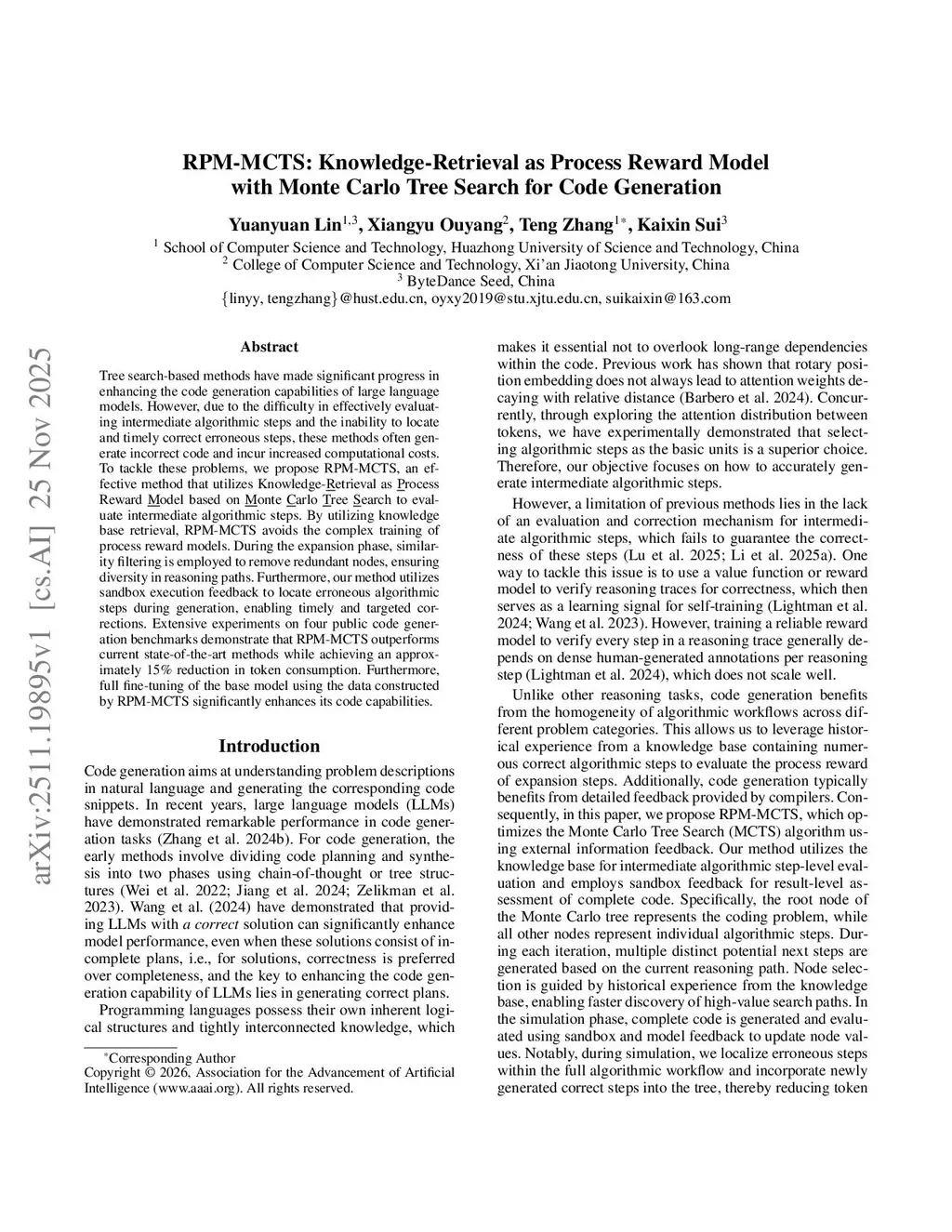 Tree search-based methods have made significant progress in enhancing the code generation capabilities of large language models. However, due to the difficulty in effectively evaluating intermediate algorithmic steps and the inability to locate and timely correct erroneous steps, these methods often generate incorrect code and incur increased computational costs. To tackle these problems, we propose RPM-MCTS, an effective method that utilizes Knowledge-Retrieval as Process Reward Model based on Monte Carlo Tree Search to evaluate intermediate algorithmic steps. By utilizing knowledge base retrieval, RPM-MCTS avoids the complex training of process reward models. During the expansion phase, similarity filtering is employed to remove redundant nodes, ensuring diversity in reasoning paths. Furthermore, our method utilizes sandbox execution feedback to locate erroneous algorithmic steps during generation, enabling timely and targeted corrections. Extensive experiments on four public code generation benchmarks demonstrate that RPM-MCTS outperforms current state-of-the-art methods while achieving an approximately 15% reduction in token consumption. Furthermore, full fine-tuning of the base model using the data constructed by RPM-MCTS significantly enhances its code capabilities.