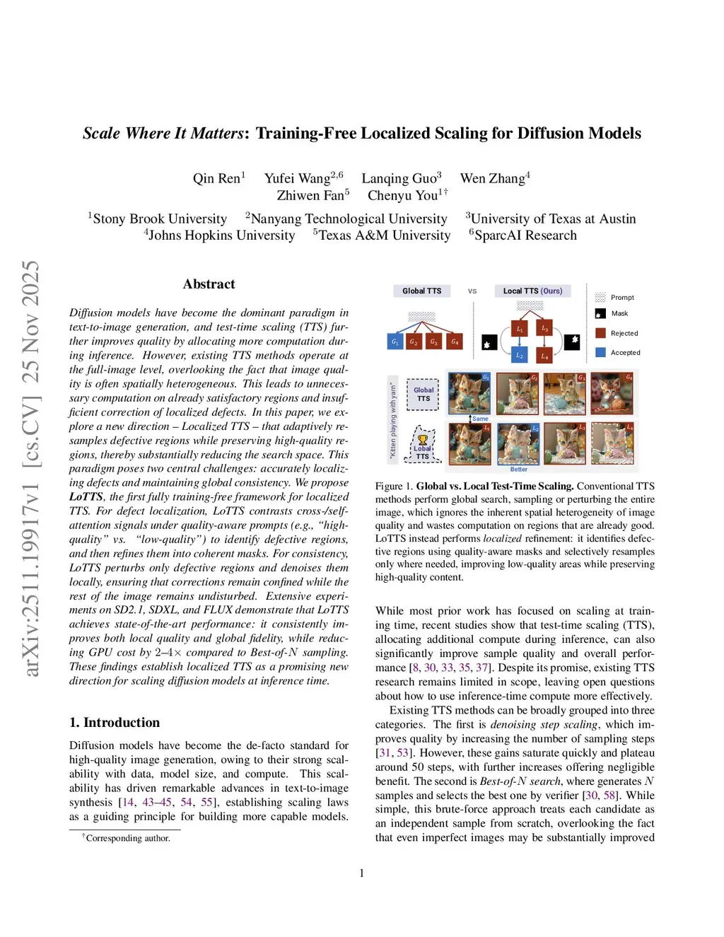 Diffusion models have become the dominant paradigm in text-to-image generation, and test-time scaling (TTS) further improves quality by allocating more computation during inference. However, existing TTS methods operate at the full-image level, overlooking the fact that image quality is often spatially heterogeneous. This leads to unnecessary computation on already satisfactory regions and insufficient correction of localized defects. In this paper, we explore a new direction - Localized TTS - that adaptively resamples defective regions while preserving high-quality regions, thereby substantially reducing the search space. This paradigm poses two central challenges: accurately localizing defects and maintaining global consistency. We propose LoTTS, the first fully training-free framework for localized TTS. For defect localization, LoTTS contrasts cross- and self-attention signals under quality-aware prompts (e.g., high-quality vs. low-quality) to identify defective regions, and then refines them into coherent masks. For consistency, LoTTS perturbs only defective regions and denoises them locally, ensuring that corrections remain confined while the rest of the image remains undisturbed. Extensive experiments on SD2.1, SDXL, and FLUX demonstrate that LoTTS achieves state-of-the-art performance: it consistently improves both local quality and global fidelity, while reducing GPU cost by 2-4x compared to Best-of-N sampling. These findings establish localized TTS as a promising new direction for scaling diffusion models at inference time.