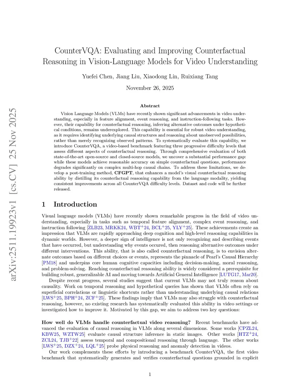 Vision Language Models (VLMs) have recently shown significant advancements in video understanding, especially in feature alignment, event reasoning, and instruction-following tasks. However, their capability for counterfactual reasoning, inferring alternative outcomes under hypothetical conditions, remains underexplored. This capability is essential for robust video understanding, as it requires identifying underlying causal structures and reasoning about unobserved possibilities, rather than merely recognizing observed patterns. To systematically evaluate this capability, we introduce CounterVQA, a video-based benchmark featuring three progressive difficulty levels that assess different aspects of counterfactual reasoning. Through comprehensive evaluation of both state-of-the-art open-source and closed-source models, we uncover a substantial performance gap: while these models achieve reasonable accuracy on simple counterfactual questions, performance degrades significantly on complex multi-hop causal chains. To address these limitations, we develop a post-training method, CFGPT, that enhances a model's visual counterfactual reasoning ability by distilling its counterfactual reasoning capability from the language modality, yielding consistent improvements across all CounterVQA difficulty levels. Dataset and code will be further released.