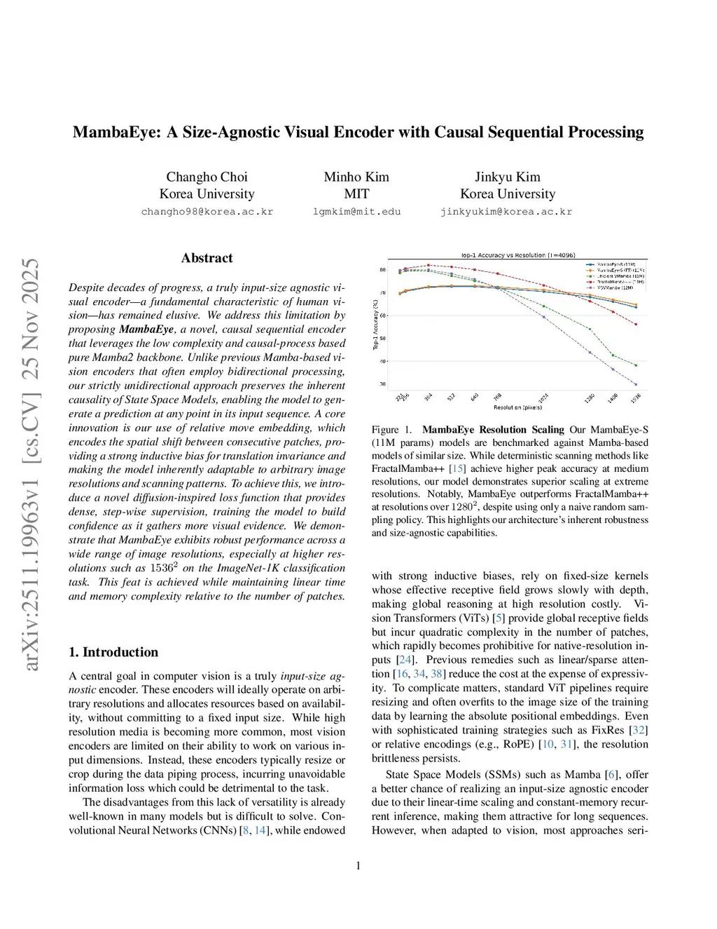 Despite decades of progress, a truly input-size agnostic visual encoder-a fundamental characteristic of human vision-has remained elusive. We address this limitation by proposing \textbf{MambaEye}, a novel, causal sequential encoder that leverages the low complexity and causal-process based pure Mamba2 backbone. Unlike previous Mamba-based vision encoders that often employ bidirectional processing, our strictly unidirectional approach preserves the inherent causality of State Space Models, enabling the model to generate a prediction at any point in its input sequence. A core innovation is our use of relative move embedding, which encodes the spatial shift between consecutive patches, providing a strong inductive bias for translation invariance and making the model inherently adaptable to arbitrary image resolutions and scanning patterns. To achieve this, we introduce a novel diffusion-inspired loss function that provides dense, step-wise supervision, training the model to build confidence as it gathers more visual evidence. We demonstrate that MambaEye exhibits robust performance across a wide range of image resolutions, especially at higher resolutions such as on the ImageNet-1K classification task. This feat is achieved while maintaining linear time and memory complexity relative to the number of patches.
