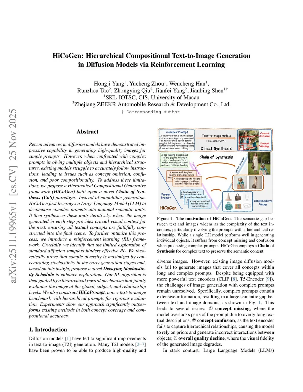 Recent advances in diffusion models have demonstrated impressive capability in generating high-quality images for simple prompts. However, when confronted with complex prompts involving multiple objects and hierarchical structures, existing models struggle to accurately follow instructions, leading to issues such as concept omission, confusion, and poor compositionality. To address these limitations, we propose a Hierarchical Compositional Generative framework (HiCoGen) built upon a novel Chain of Synthesis (CoS) paradigm. Instead of monolithic generation, HiCoGen first leverages a Large Language Model (LLM) to decompose complex prompts into minimal semantic units. It then synthesizes these units iteratively, where the image generated in each step provides crucial visual context for the next, ensuring all textual concepts are faithfully constructed into the final scene. To further optimize this process, we introduce a reinforcement learning (RL) framework. Crucially, we identify that the limited exploration of standard diffusion samplers hinders effective RL. We theoretically prove that sample diversity is maximized by concentrating stochasticity in the early generation stages and, based on this insight, propose a novel Decaying Stochasticity Schedule to enhance exploration. Our RL algorithm is then guided by a hierarchical reward mechanism that jointly evaluates the image at the global, subject, and relationship levels. We also construct HiCoPrompt, a new text-to-image benchmark with hierarchical prompts for rigorous evaluation. Experiments show our approach significantly outperforms existing methods in both concept coverage and compositional accuracy.
