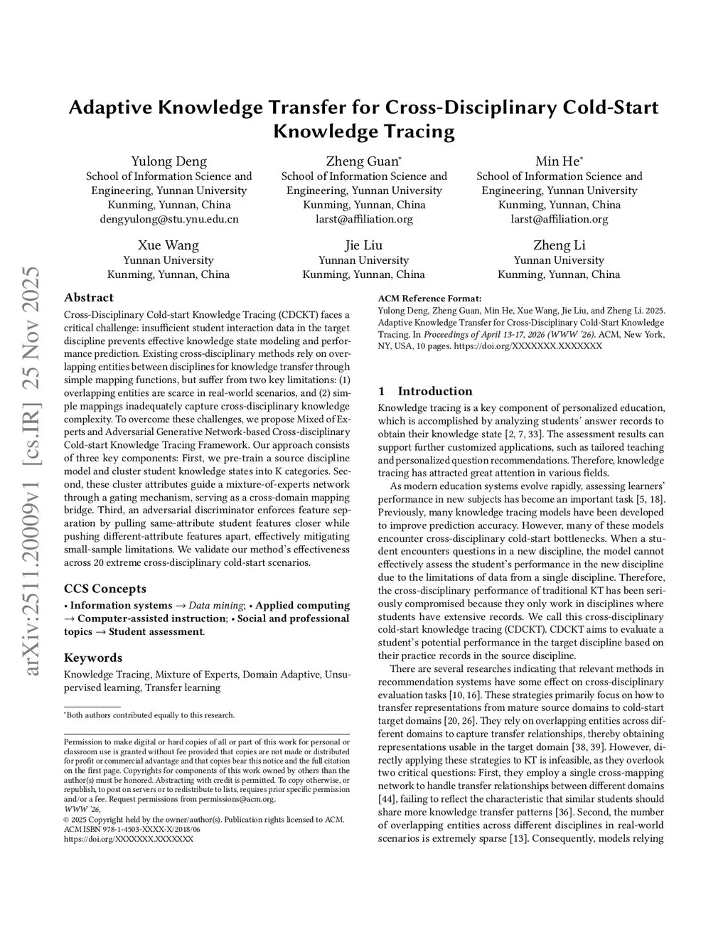 Adaptive Knowledge Transfer for Cross-Disciplinary Cold-Start Knowledge Tracing