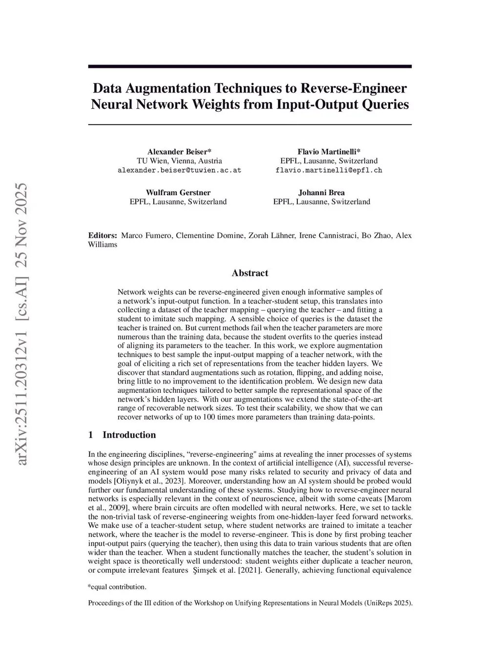 Network weights can be reverse-engineered given enough informative samples of a network's input-output function. In a teacher-student setup, this translates into collecting a dataset of the teacher mapping -- querying the teacher -- and fitting a student to imitate such mapping. A sensible choice of queries is the dataset the teacher is trained on. But current methods fail when the teacher parameters are more numerous than the training data, because the student overfits to the queries instead of aligning its parameters to the teacher. In this work, we explore augmentation techniques to best sample the input-output mapping of a teacher network, with the goal of eliciting a rich set of representations from the teacher hidden layers. We discover that standard augmentations such as rotation, flipping, and adding noise, bring little to no improvement to the identification problem. We design new data augmentation techniques tailored to better sample the representational space of the network's hidden layers. With our augmentations we extend the state-of-the-art range of recoverable network sizes. To test their scalability, we show that we can recover networks of up to 100 times more parameters than training data-points.