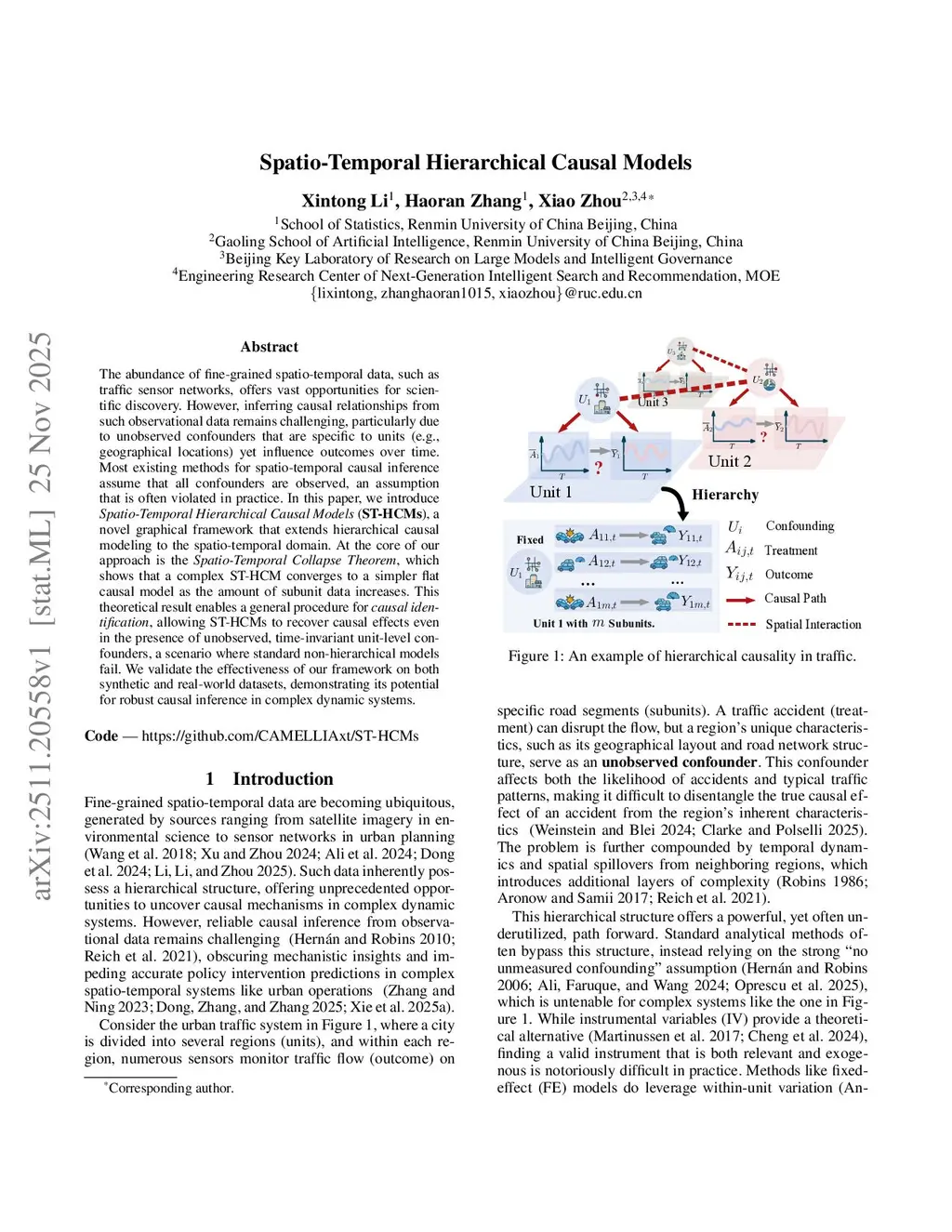 The abundance of fine-grained spatio-temporal data, such as traffic sensor networks, offers vast opportunities for scientific discovery. However, inferring causal relationships from such observational data remains challenging, particularly due to unobserved confounders that are specific to units (e.g., geographical locations) yet influence outcomes over time. Most existing methods for spatio-temporal causal inference assume that all confounders are observed, an assumption that is often violated in practice. In this paper, we introduce Spatio-Temporal Hierarchical Causal Models (ST-HCMs), a novel graphical framework that extends hierarchical causal modeling to the spatio-temporal domain. At the core of our approach is the Spatio-Temporal Collapse Theorem, which shows that a complex ST-HCM converges to a simpler flat causal model as the amount of subunit data increases. This theoretical result enables a general procedure for causal identification, allowing ST-HCMs to recover causal effects even in the presence of unobserved, time-invariant unit-level confounders, a scenario where standard non-hierarchical models fail. We validate the effectiveness of our framework on both synthetic and real-world datasets, demonstrating its potential for robust causal inference in complex dynamic systems.