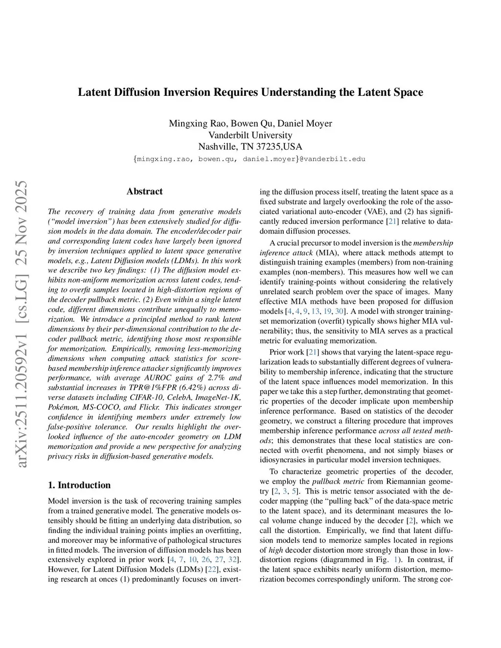 The recovery of training data from generative models (``model inversion'') has been extensively studied for diffusion models in the data domain. The encoder/decoder pair and corresponding latent codes have largely been ignored by inversion techniques applied to latent space generative models, e.g., Latent Diffusion models (LDMs). In this work we describe two key findings: (1) The diffusion model exhibits non-uniform memorization across latent codes, tending to overfit samples located in high-distortion regions of the decoder pullback metric. (2) Even within a single latent code, different dimensions contribute unequally to memorization. We introduce a principled method to rank latent dimensions by their per-dimensional contribution to the decoder pullback metric, identifying those most responsible for memorization. Empirically, removing less-memorizing dimensions when computing attack statistics for score-based membership inference attacker significantly improves performance, with average AUROC gains of 2.7\% and substantial increases in TPR@1\%FPR (6.42\%) across diverse datasets including CIFAR-10, CelebA, ImageNet-1K, Pokémon, MS-COCO, and Flickr. This indicates stronger confidence in identifying members under extremely low false-positive tolerance. Our results highlight the overlooked influence of the auto-encoder geometry on LDM memorization and provide a new perspective for analyzing privacy risks in diffusion-based generative models.